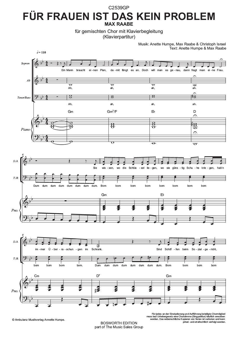 Der Titelsong 'Für Frauen ist das kein Problem' aus Max Raabes gleichnamigem Album von 2013, arrangiert für gemischten Chor SATB mit Klavierbegleitung. Das Set besteht aus der Klavierpartitur (8 Seiten) und der Singpartitur (8 Seiten) in 10facher Ausführung. Das Set kommt eingeschweisst in einer Chormappe. Klavier- und Singpartitur können einzeln über die Bosworth Chor Edition in Köln bezogen werden (0221-8906160; bosworthchor@web.de): C2539GP Klavierpartitur; C2539G1 Singpartitur.