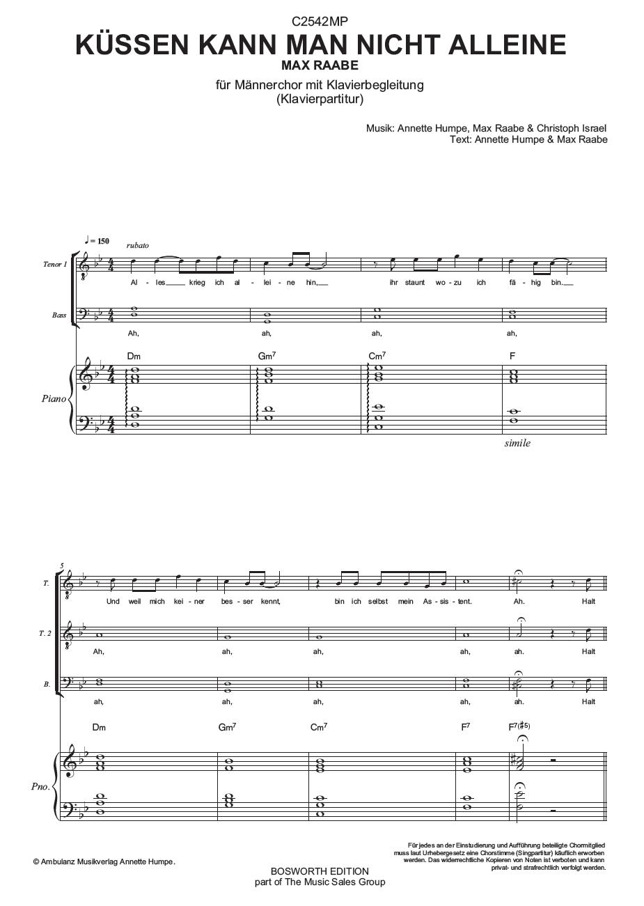 Der Titelsong 'Küssen kann man nicht alleine' aus Max Raabes gleichnamigem Album von 2011, arrangiert für Männerchor TTBB mit Klavierbegleitung. Das Set besteht aus der Klavierpartitur (8 Seiten) und der Singpartitur (8 Seiten) in 10facher Ausführung. Das Set kommt eingeschweisst in einer Chormappe. Klavier- und Singpartitur können einzeln über die Bosworth Chor Edition in Köln bezogen werden (0221-8906160; bosworthchor@web.de): C2542MP Klavierpartitur C2542M1 Singpartitur Das gleichnamige Songbook mit allen Songs des Tonträgers 'Küssen kann man nicht alleine' gibt es von Bosworth unter der Bestellnummer BOE7569 / ISBN 9783865436764.