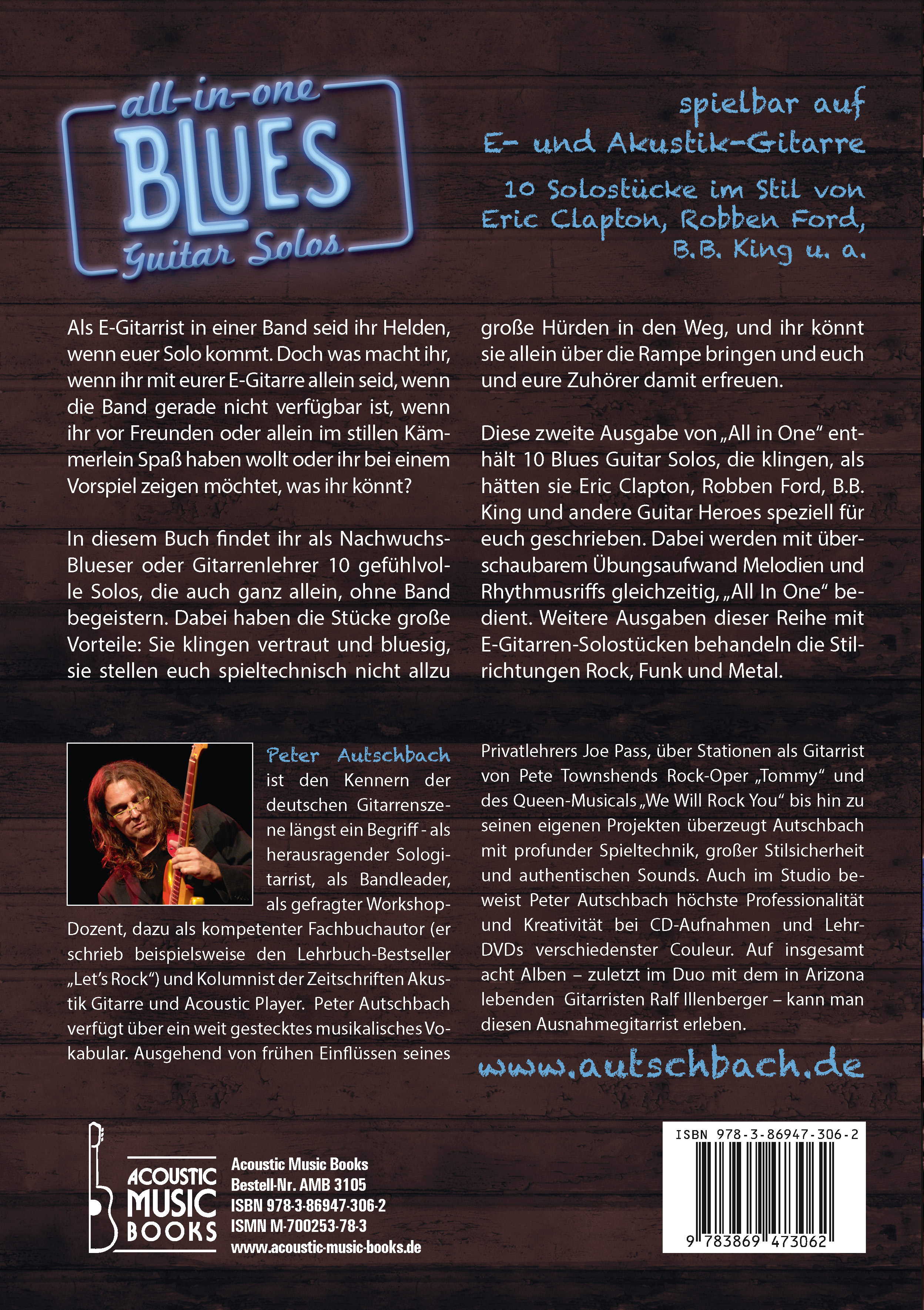 Vorwort Als E-Gitarrist in einer Band seid ihr Helden, wenn euer Solo kommt. Doch was macht ihr, wenn ihr mit eurer E-Gitarre allein seid, wenn die Band gerade nicht verfügbar ist, wenn ihr vor Freunden oder allein im stillen Kämmerlein Spaß haben wollt oder ihr bei einem Vorspiel zeigen möchtet, was ihr könnt? In dieser Ausgabe findet ihr für diese Gelegenheiten nun 10 gefühlvolle Solos, die auch ganz allein, ohne Band begeistern. Diese zweite Ausgabe von 'All in One' enthält 10 Blues Guitar Solos, die klingen, als hätten sie Eric Clapton, Robben Ford, B.B. King und andere Guitar Heroes speziell für euch geschrieben. Dabei haben die Stücke große Vorteile: Sie klingen vertraut und bluesig, sie stellen euch spieltechnisch nicht allzu große Hürden in den Weg, und ihr könnt sie allein über die Rampe bringen und euch und eure Zuhörer damit erfreuen. Als Gitarrenlehrer erhält man mit diesem Buch sowohl motivierendes als auch überraschend leicht spielbares E-Gitarren-Material an die Hand, das ohne jegliche Begleitung oder Playbacks aufgeführt werden kann. Beim Unterrichten habe ich selbst immer die Existenz von E-Gitarrenstücken vermisst, die mit moderatem Übungsaufwand spielbar sind und bei denen gleichzeitig Melodien und Rhythmusriffs bedient werden, 'All in One'. Die notwendigen E-Gitarren-Techniken werden übrigens im Lehrbuch-Bestseller 'Let’s Rock' erklärt, das ebenfalls bei Acoustic Music Books erschienen ist. Die Ausgaben von 'All in One. Guitar-Solos' stellen damit eine ideale Ergänzung zum Lehrbuch dar. Viel Spaß mit den Solos wünscht euch Peter Autschbach