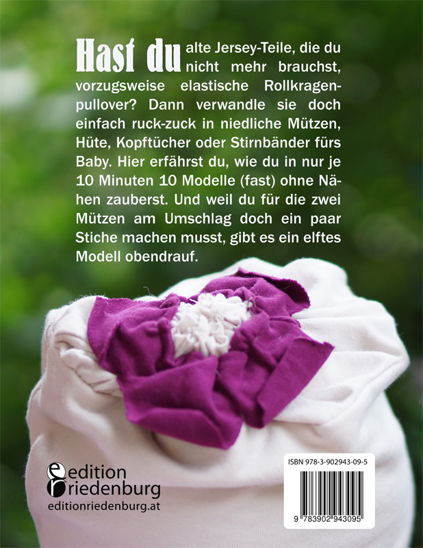 Hast du alte Jersey-Teile, die du nicht mehr brauchst, vorzugsweise elastische Rollkragenpullover? Dann verwandle sie doch einfach ruck-zuck in niedliche Mützen, Hüte, Kopftücher oder Stirnbänder fürs Baby. Hier erfährst du, wie du in nur je 10 Minuten 10 Modelle (fast) ohne Nähen zauberst. Und weil du für die zwei Mützen am Umschlag doch ein paar Stiche machen musst, gibt es ein elftes Modell obendrauf. *** Vorwort: Vielleicht ist es dir auch schon einmal passiert, dass du ohne Babymütze auf Reisen warst und improvisieren musstest. Die folgenden Modelle sind aber eigentlich viel zu hübsch, als dass man auf eine solche Gelegenheit warten sollte.Fang daher gleich mal an, deinen Kleiderschrank gezielt auf nicht mehr gebrauchte Jersey-Teile zu filzen. Hast du alte Shirts oder Rollkragenpullover? Immer her damit! Und dann: Ran an die Schere, aus alt mach neu!Bis auf die beiden Modelle auf dem Buchumschlag kannst du alle vorgestellten Babymützchen ohne Nähen anfertigen. Du brauchst lediglich eine Schere. Diese sollte spitz sein und eine ausreichende Länge haben. Aber notfalls tut es auch eine Nagelschere.Ich verzichte bei den Anleitungen bewusst auf genaue Maßangaben, denn wie groß der Kopf deines Babys gerade ist, weißt am besten du. Nimm dein Baby als "Vorlage", was die Passform angeht. Oder ein kopftaugliches Stofftier oder ein Glas (diese "Ersatz-Modelle" werden dir auch in diesem Buch begegnen).Viel Spaß mit den von dir selbstgemachten Babymützen wünscht dir CarolinePS: Damit du deine schnittigen Erfolge auch festhalten kannst, gibt es am Ende freie Seiten zum Einkleben eigener Babyfotos.