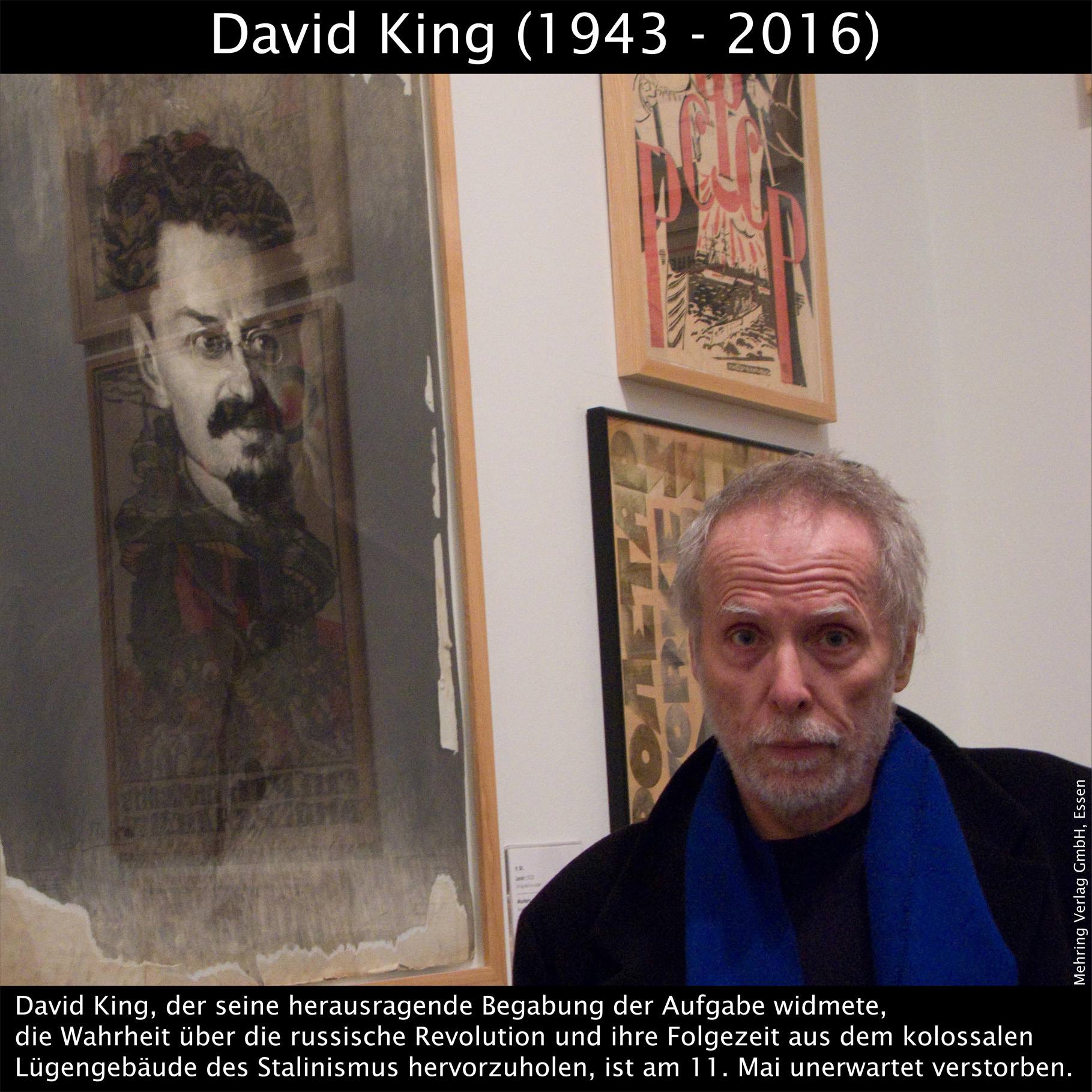 David King (1943–2016) war ein britischer Grafikdesigner und Besitzer einer der bedeutendsten Sammlungen russischer revolutionärer Kunst. Er war Leiter des Kunstressorts bei der »Sunday Times« von 1965 bis 1975 und lebte in London. Obwohl er seit vielen Jahren an einer Herzerkrankung litt, bewahrte er sich bis zum Ende seines Lebens eine erstaunliche Schaffenskraft. Sein letztes Buch, das 2015 erschien, handelt von John Heartfield, dem revolutionären Künstler aus der Weimarer Republik, dessen Leben und Werk King stark beeinflusste.