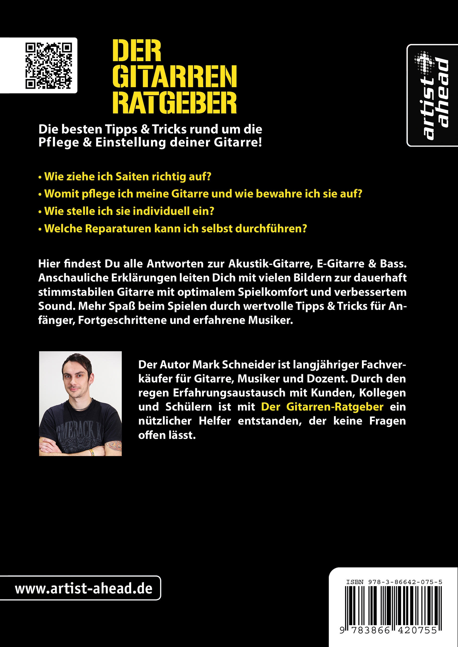 Mark Schneider ist langjähriger Fachverkäufer für Gitarre, Musiker und Dozent. Durch den regen Erfahrungsaustausch mit Kunden, Kollegen und Schülern ist mit "Der Gitarren-Ratgeber" ein nützlicher Helfer entstanden, der keine Fragen offen lässt.