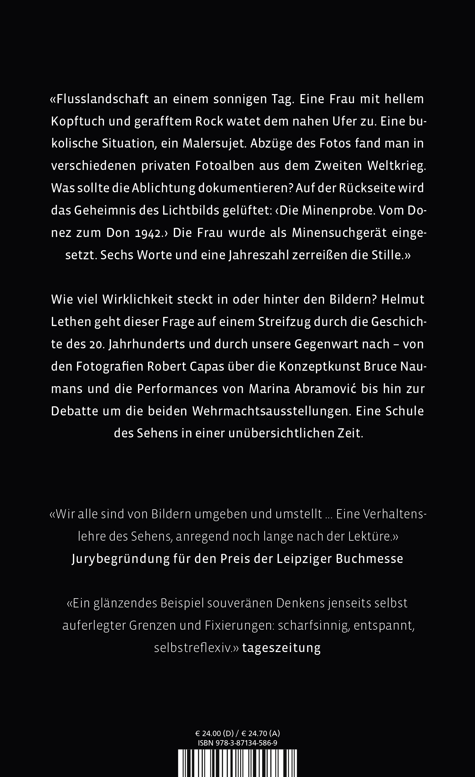 Er zeigt uns am Beispiel der berühmten Fotografien Robert Capas von der Landung in der Normandie, wie aus Bildern Geschichtszeichen werden; er folgt gebannt den Performances von Marina Abramovic, in denen Kunst und Wirklichkeit verschmelzen; er vertieft sich in das ironische Zeichenspiel des Konzeptkünstlers Bruce Nauman, das jede Realität dahinter verschwinden lässt; er entdeckt in idyllisch anmutenden Bildern jene totale Verlassenheit, die ihn bereits als Kind erschreckte. Lethen erläutert, was Bilder sind und was sie vermögen, ohne dabei die Wirklichkeit hinter ihnen preiszugeben.