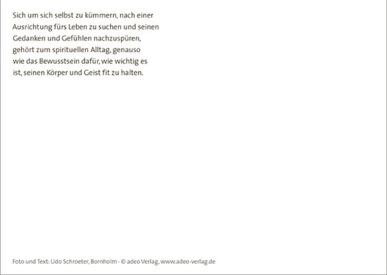 UDO SCHROETER lebt und arbeitet in der Natur und gibt als Coach sein tiefes Verständnis zentraler Lebenszusammenhänge in Seminaren weiter. Mit seiner Frau und den beiden Kindern ist er nach Bornholm ausgewandert, wo er auch eine Fotogalerie betreibt. www.udoschroeter.com