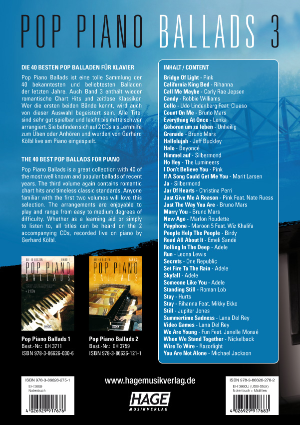 Pop Piano Ballads ist eine tolle Sammlung der 40 bekanntesten und beliebtesten Balladen der letzten Jahre. Auch Band 3 enthält wieder romantische Chart Hits und zeitlose Klassiker von Adele, Bruno Mars, Rihanna, Michael Jackson, Silbermond, Robbie Williams, Pink, Udo Lindenberg, Lana Del Rey und vielen anderen Superstars. Wer die ersten beiden Bände kennt, wird auch von dieser Auswahl begeistert sein.Alle Titel sind sehr gut spielbar und leicht bis mittelschwer arrangiert. Sie befinden sich auf 2 CDs als Lernhilfe zum Üben oder Anhören und wurden von Gerhard Kölbl live am Piano eingespielt. Pop Piano Ballads 3 ist auch als Ausgabe mit 40 erstklassigen Midifiles in GM/XG/XF erhältlich.Damit das Buch offen liegen bleibt und sehr leicht umgeblättert werden kann, wurde es mit einer hochwertigen PUR-Klebebindung gebunden. Der Buchrücken kann nach hinten umgeknickt werden.