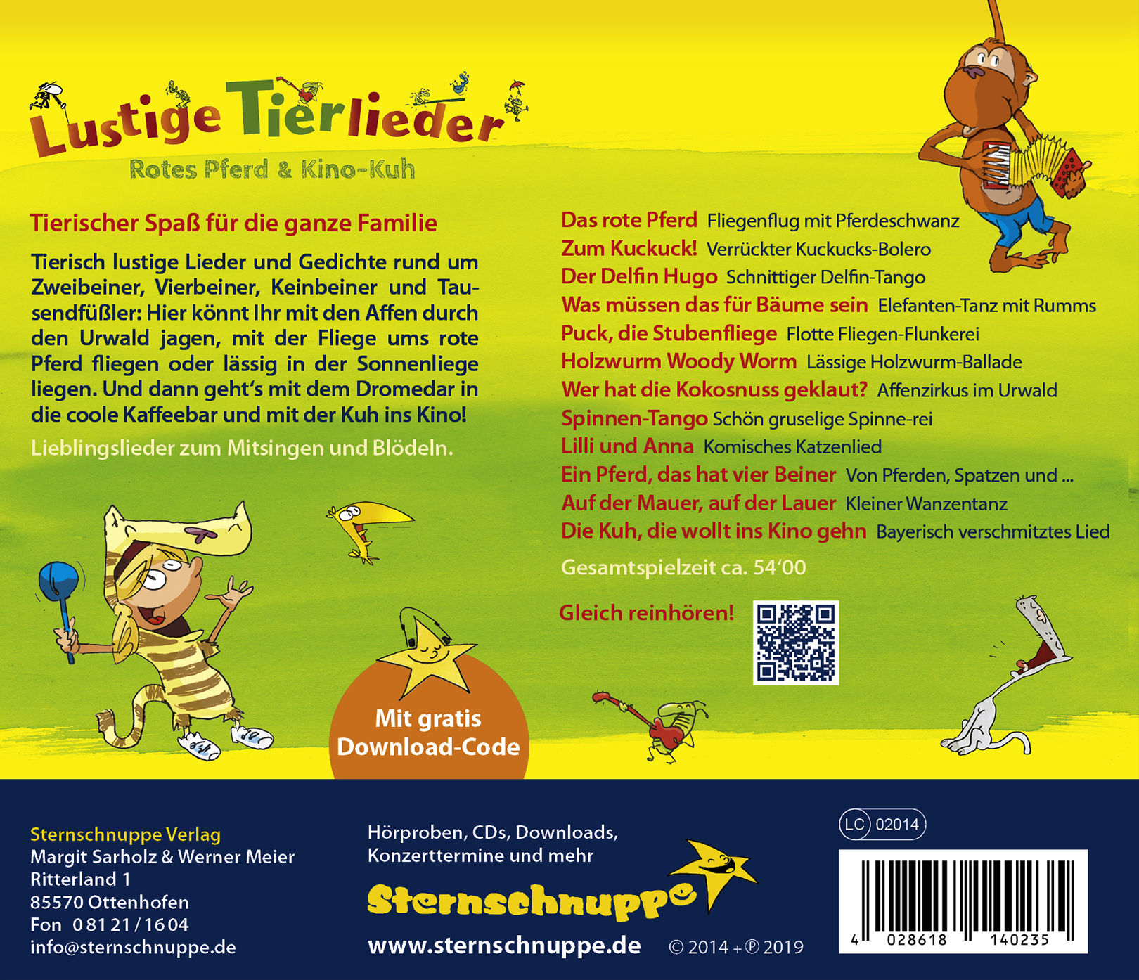 Mit der CD 'Lustige Tierlieder' startet der bekannte Kinderlieder-Verlag Sternschnuppe seine neue Serie 'Lieblingslieder'. Auf der ersten Scheibe der thematisch sortierten Lieblingslieder-CDs haben die beiden Künstler Margit Sarholz und Werner Meier 12 lustige Tierlieder versammelt. Mit dabei sind Klassiker wie das Lied vom roten Pferd und der Kuh, die ins Kino geht, aber auch noch viele andere ohrwurmgeeignete Hits vom Holzwurm Woody Worm, kokosnussklauenden Affen im Urwald und Stubenfliegen, die in der Sonne liegen. Zum Mitmachen, Schmunzeln und Blödeln animieren nicht nur die verrückt-verreimten lustigen Liedtexte, sondern auch die witzigen Gedichte rund um Zweibeiner, Vierbeiner, Achtbeiner oder Tausendfüßler. Das wird ein tierischer Spaß für die ganze Familie. In hübscher Papp-Klapp-Box mit Textbüchlein.