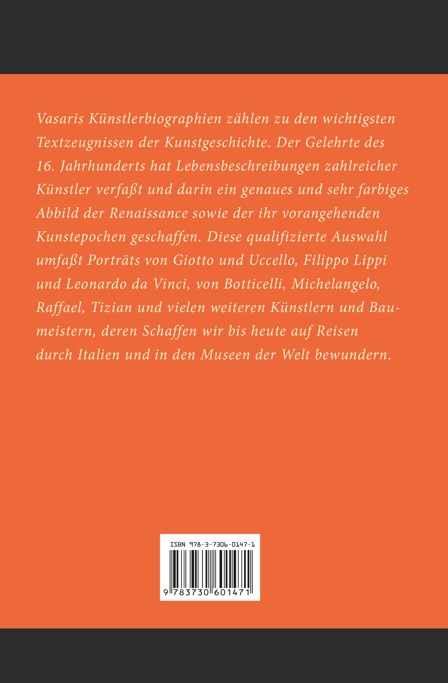 Vasaris Künstlerbiografien zählen zu den wichtigsten Textzeugnissen der Kunstgeschichte. Der Gelehrte des 16. Jahrhunderts hat Lebensbeschreibungen zahlreicher Künstler verfasst und darin ein genaues und sehr farbiges Abbild der Renaissance sowie der ihr vorangehenden Kunstepochen geschaffen. Diese qualifizierte Auswahl umfasst Porträts von Giotto und Uccello, Filippo Lippi und Leonardo da Vinci, von Botticelli, Michelangelo, Raffael, Tizian und vielen weiteren Künstlern und Baumeistern, deren Schaffen wir bis heute auf Reisen durch Italien und in den Museen der Welt bewundern.