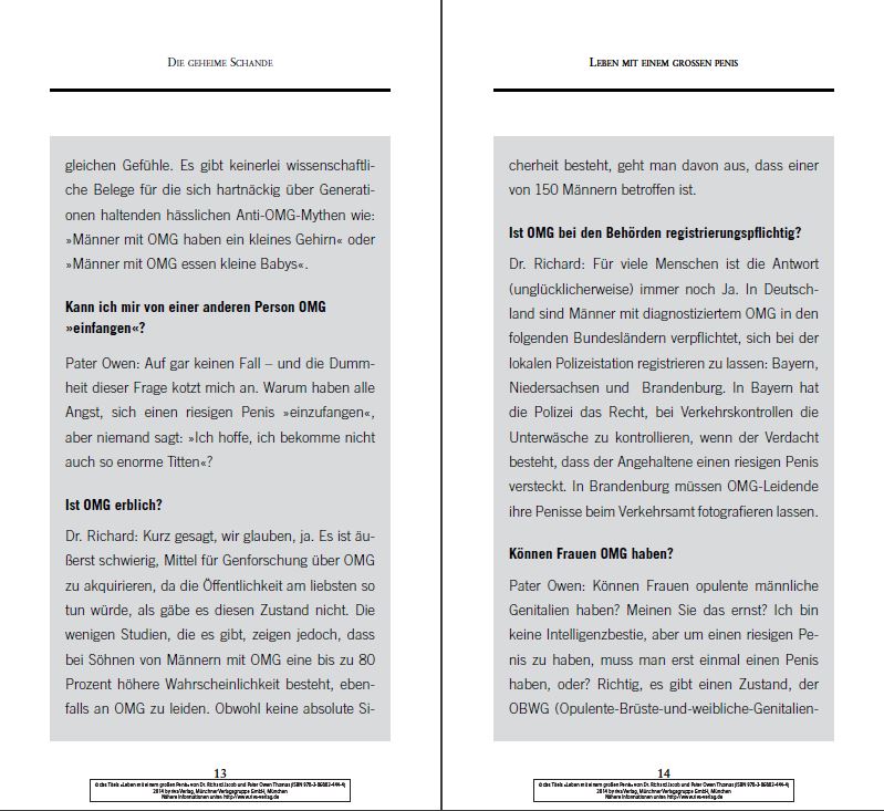 Endlich gibt es das erste Selbsthilfebuch für Männer, die unter OMG (Opulenten männichen Genitalien) leiden. OMG ist ein genetischer Defekt, bei dem der Penis absurd große Ausmaße annimmt. Jedes Jahr wird bei Tausenden von Männern OMG diagnostiziert. Leider bedeutet diese Diagnose für die meisten ein Leben am Rande der Gesellschaft. Leben mit einem großen Penis verkündet diesen Männern nun erstmals die frohe Botschaft von Hoffnung und Toleranz. Außerdem erhalten sie wichtige und hilfreiche Informationen u.?a. über:> Outing: Wie sagt man es Familie und Freunden?> Geschlechtsverkehr mit einem riesigen Penis> Unerwartete Vorteile eines riesigen PenisDieser wertvolle Ratgeber enthält Gebete, Gedichte, ein Affirmationstagebuch und gedankenvolle Zitate von Experten, die den Männern helfen werden, OMG für sich zu akzeptieren. Ein Muss für alle, die unter diesem Phänomen leiden.