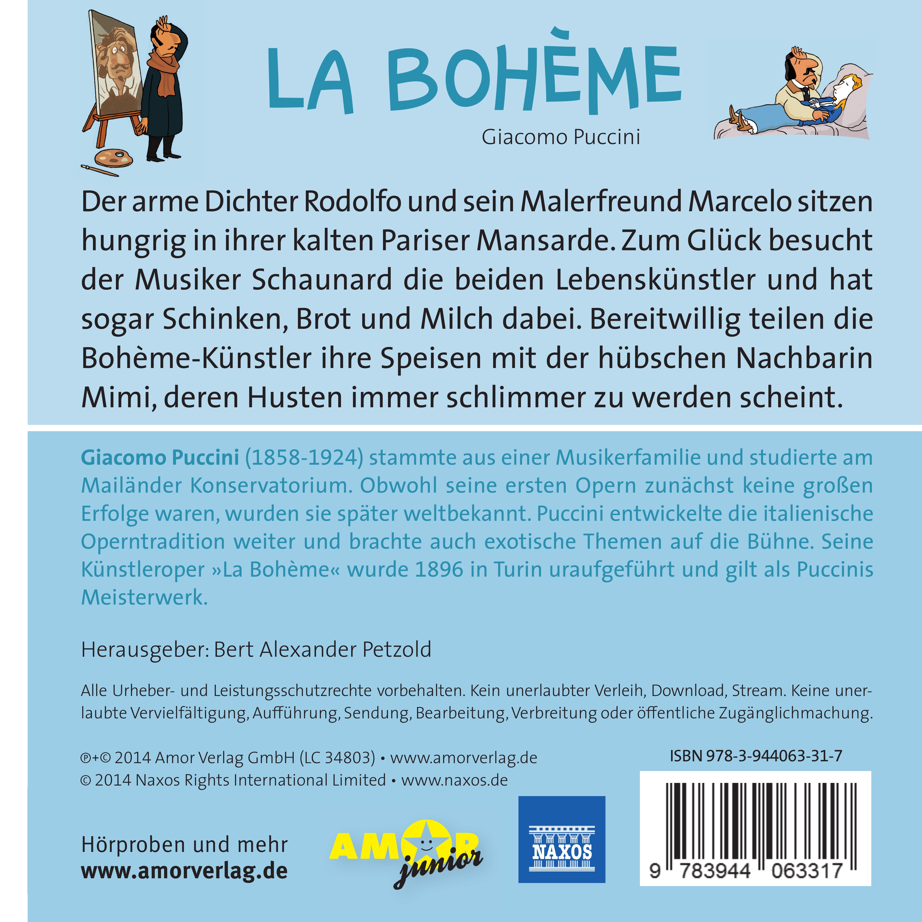 Wir hören Giacomo Puccinis weltweit beliebte Oper "La Bohème" als spannendes und musikreiches Hörspiel in einer kindgerechten Version für die ganze Familie. Mit beliebten Arien, zahlreichen Rollenstimmen und lebhaften Geräuschen bietet dieses Hörspiel einen unterhaltsamen und faszinierenden Einstieg in die beeindruckende Welt der klassischen Musik und der Oper. Das Hörspiel erscheint im Amor-Verlag als Teil der ZEIT-Edition "Große Oper für kleine Hörer", deren Herausgeber Bert Alexander Petzold ist. Alle Cover der Serie sind im witzig-hintersinnigen Illustrationsstil von Ole Könnecke gestaltet, einem der erfolgreichsten Kinderbuchillustratoren Deutschlands.