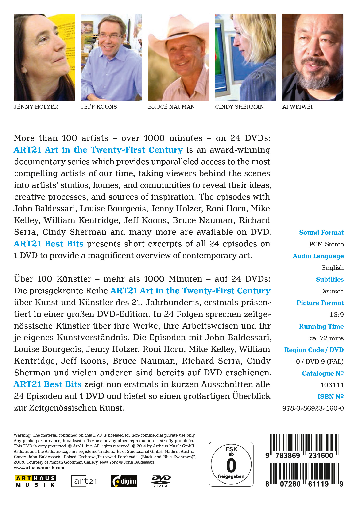 Über 100 Künstler mehr als 1000 Minuten auf 24 DVDs: Die preisgekrönte Reihe ART21 Art in the Twenty-First Century über Kunst und Künstler des 21. Jahrhunderts, erstmals präsentiert in einer großen DVD-Edition. In 24 Folgen sprechen zeitgenössische Künstler über ihre Werke, ihre Arbeitsweisen und ihr je eigenes Kunstverständnis. Die Episoden mit John Baldessari, Louise Bourgeois, Jenny Holzer, Roni Horn, Mike Kelley, William Kentridge, Jeff Koons, Bruce Nauman, Richard Serra, Cindy Sherman und vielen anderen sind bereits auf DVD erschienen. ART21 Best Bits zeigt nun erstmals in kurzen Ausschnitten alle 24 Episoden auf 1 DVD und bietet so einen großartigen Überblick zur Zeitgenössischen Kunst.