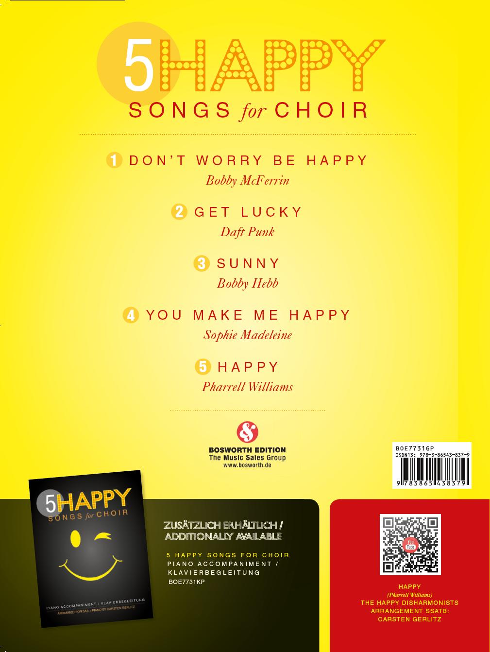 Der sich auf dem Rückumschlag von Gesangs- und Klavierpartitur befindende QR-Code verlinkt zu Youtube. Ein Chor interpretiert in diesem Video Gerlitz' Arrangement von Pharrell Williams' 'Happy'. Dies kann als Orientierung für das Proben dienen.