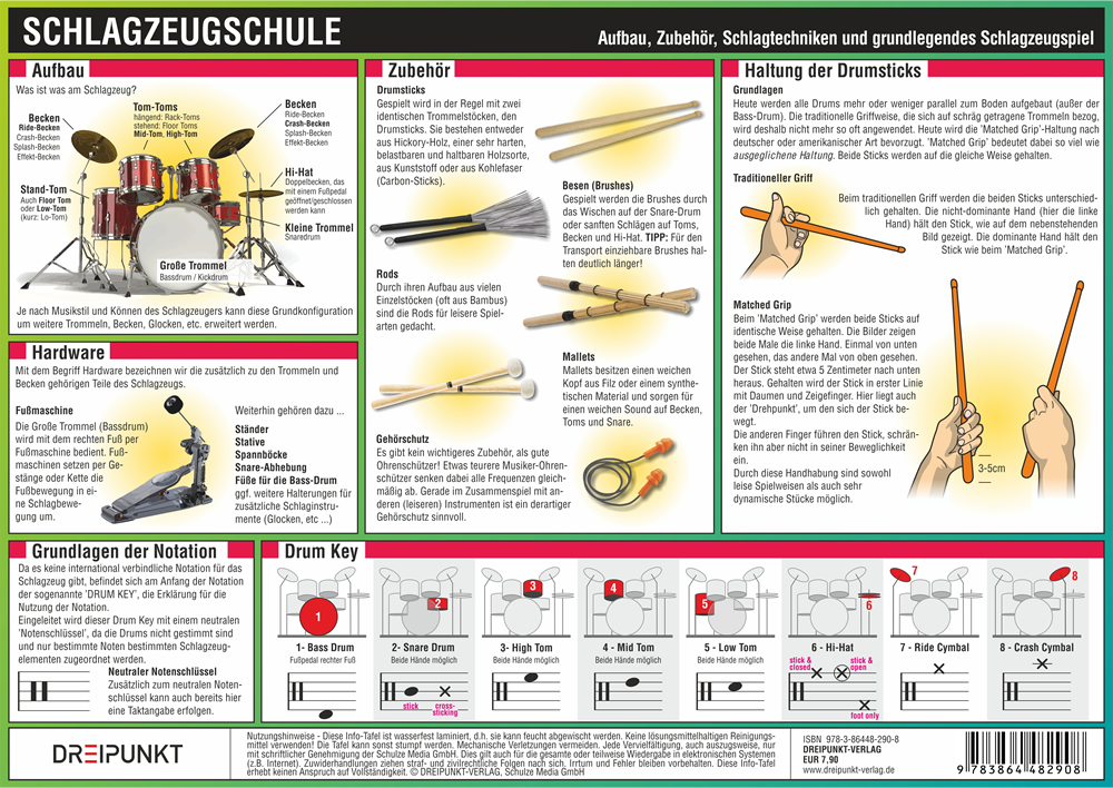 | Schlagworte | Beats • Brushes • Diddles • Dreipunkt • Dreipunkt Verlag • Dreipunkt-Verlag • Drum • Flams • Grooves • Info Tafel • Info-Tafel • Instrument lernen • Musik • Musikalien Rock/Pop/Jazz; Schlagzeug u. Percussion (Poster) • Musizieren • Noten (Musik) • Percusion • Percussion • Perkussion • Rolls • Schlagzeug • Schlagzeug lernen • Schlagzeug; Nonbooks • Schlagzeugspiel • Schlagzeug spielen • Snare Drum • TAPS • Trommel |
