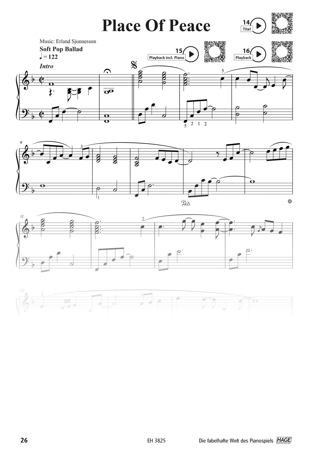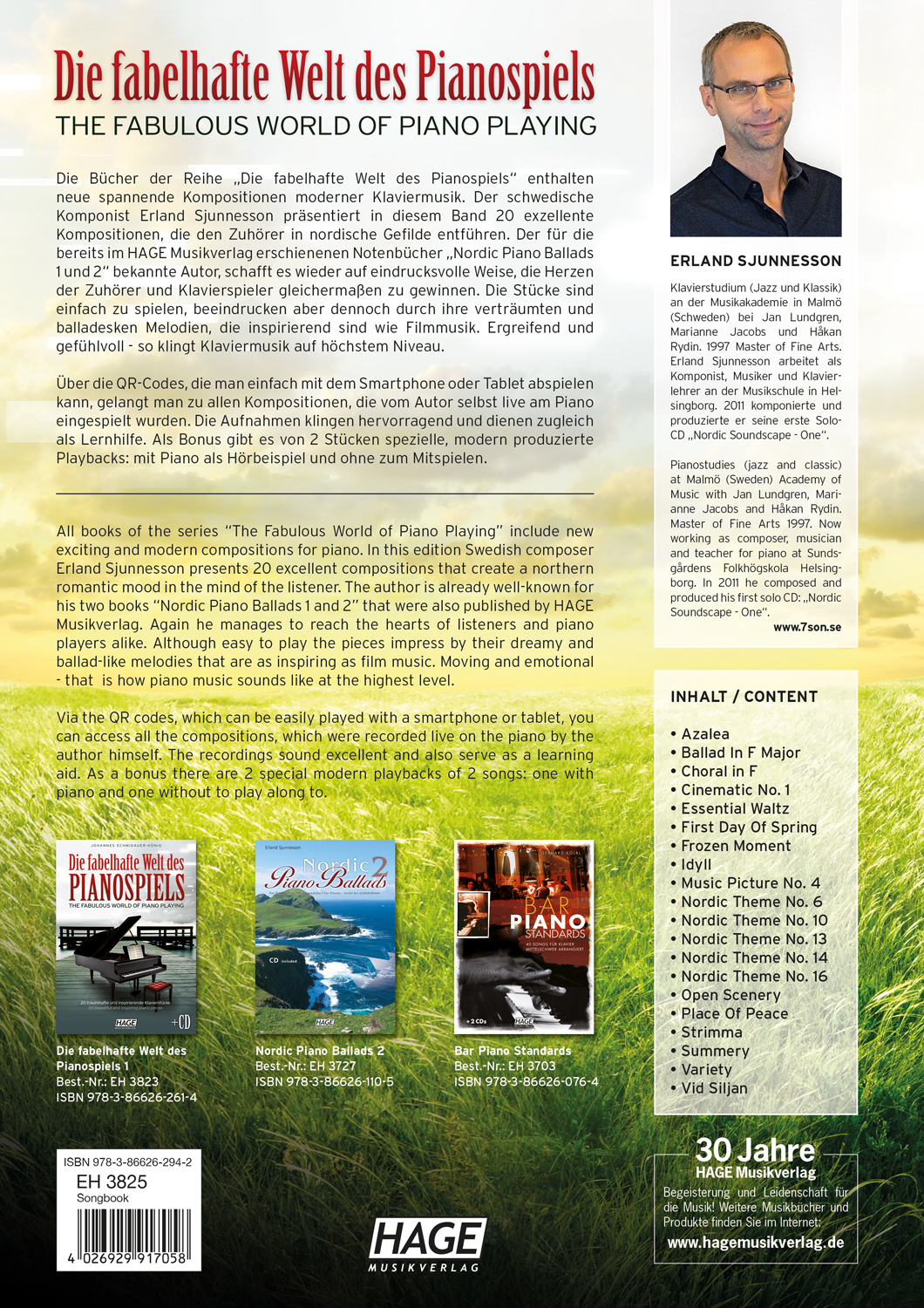 Die Bücher der Reihe "Die fabelhafte Welt des Pianospiels" enthalten neue spannende Kompositionen moderner Klaviermusik. Der schwedische Komponist Erland Sjunnesson präsentiert in diesem Band 20 exzellente Kompositionen, die den Zuhörer in nordische Gefilde entführen. Der für die bereits im HAGE Musikverlag erschienenen Notenbücher "Nordic Piano Ballads 1 und 2" bekannte Autor, schafft es wieder auf eindrucksvolle Weise, die Herzen der Zuhörer und Klavierspieler gleichermaßen zu gewinnen. Die Stücke sind einfach zu spielen, beeindrucken aber dennoch durch ihre verträumten und balladesken Melodien, die inspirierend sind wie Filmmusik. Ergreifend und gefühlvoll - so klingt Klaviermusik auf höchstem Niveau.Über die QR-Codes, die man einfach mit dem Smartphone oder Tablet abspielen kann, gelangt man zu allen Kompositionen, die vom Autor selbst live am Piano eingespielt wurden. Die Aufnahmen klingen hervorragend und dienen zugleich als Lernhilfe. Als Bonus gibt es von 2 Stücken spezielle, modern produzierte Playbacks: mit Piano als Hörbeispiel und ohne zum Mitspielen.