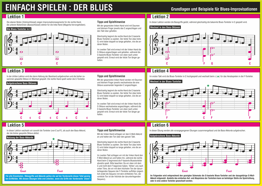Mit dieser Info-Tafel lernen Sie kein einzelnes Musikstück! Sie lernen, mit welchen Mitteln Sie jederzeit eigene Blues-Improvisationen erzeugen können. Anhand von 3 verschiedenen Blues-Tonleitern, die schnell verinnerlicht werden, kann auch der Anfänger ohne vorherige Notenkenntnisse sofort anfangen. Große, deutliche Griffbilder zeigen die Tasten und zur Unterstützung werden auch die Noten dargestellt.