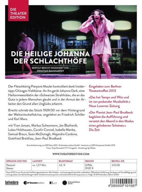 Der Fleischkönig Pierpont Mauler kontrolliert dank Insidertipps Chicagos Viehbörse. An ihn gerät Johanna Dark, eine Heilsarmeesoldatin der "Schwarzen Strohhüte", die an das Gute in jedem Menschen glaubt und in der Armut der Arbeiter den Grund allen Unglücks erkennt. Brecht schrieb das Stück 1929/30 vor dem Hintergrund der Weltwirtschaftskrise, angelehnt an Friedrich Schiller und Karl Marx.