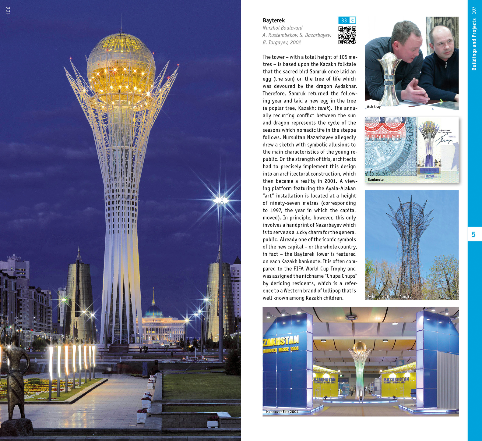 Amid the endless plains of Kazakhstan, an extraordinary architectural experiment has arisen: Astana. Formerly an outpost of the Tsarist Empire in the barren steppe, the location had developed into a typical Soviet provincial town. However, both internationally renowned and local architects are now designing spectacular and unique buildings in this dynamic city. Furthermore, Astana will host the Expo 2017 which will take place only twenty years after the city was built in the steppe alongside the old centre. The "Astana Architectural Guide" documents eighty diverse buildings and projects in the Kazakh metropolis, which was masterplanned by Kisho Kurokawa, and examines the contradictory nature at play within oriental traditions, western models and Soviet influences. Therefore, this publication represents a critical analysis of architecture and capital city planning in the centre of Eurasia.