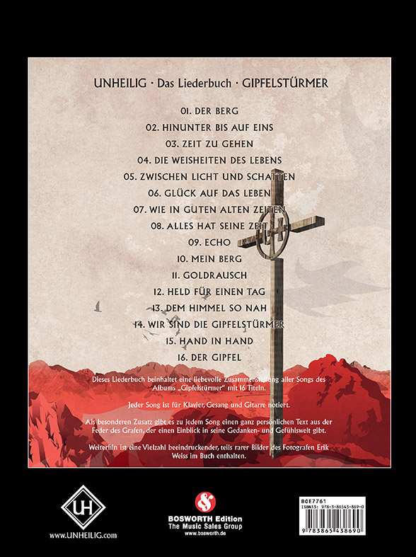 Nach mehr als 15 Jahren auf der Bühne verabschiedet sich der charismatische Graf musikalisch mit einer wahren Mammuttournee, die im September 2016 mit einem Abschlusskonzert in Köln endet. Schon nach sechs Tagen kletterte das im Dezember 2014 erschienene Album "Gipfelstürmer" auf Platz Eins der Charts. Wir freuen uns nach den Vorgängern zu "Große Freiheit" (BOE7528) und "Lichter der Stadt" (BOE7621) das dritte Songbook der erfolgreichen Band herauszugeben. Es beinhaltet alle 16 Songs der aktuellen CD wie z.B. Zeit zu gehen, Mein Berg, Held für einen Tag oder Wir sind Gipfelstürmer. Darüber hinaus dürfen die Fans wieder auf Bildmaterial und ganz persönliche Worte zu jedem Song vom Grafen selbst gespannt sein.