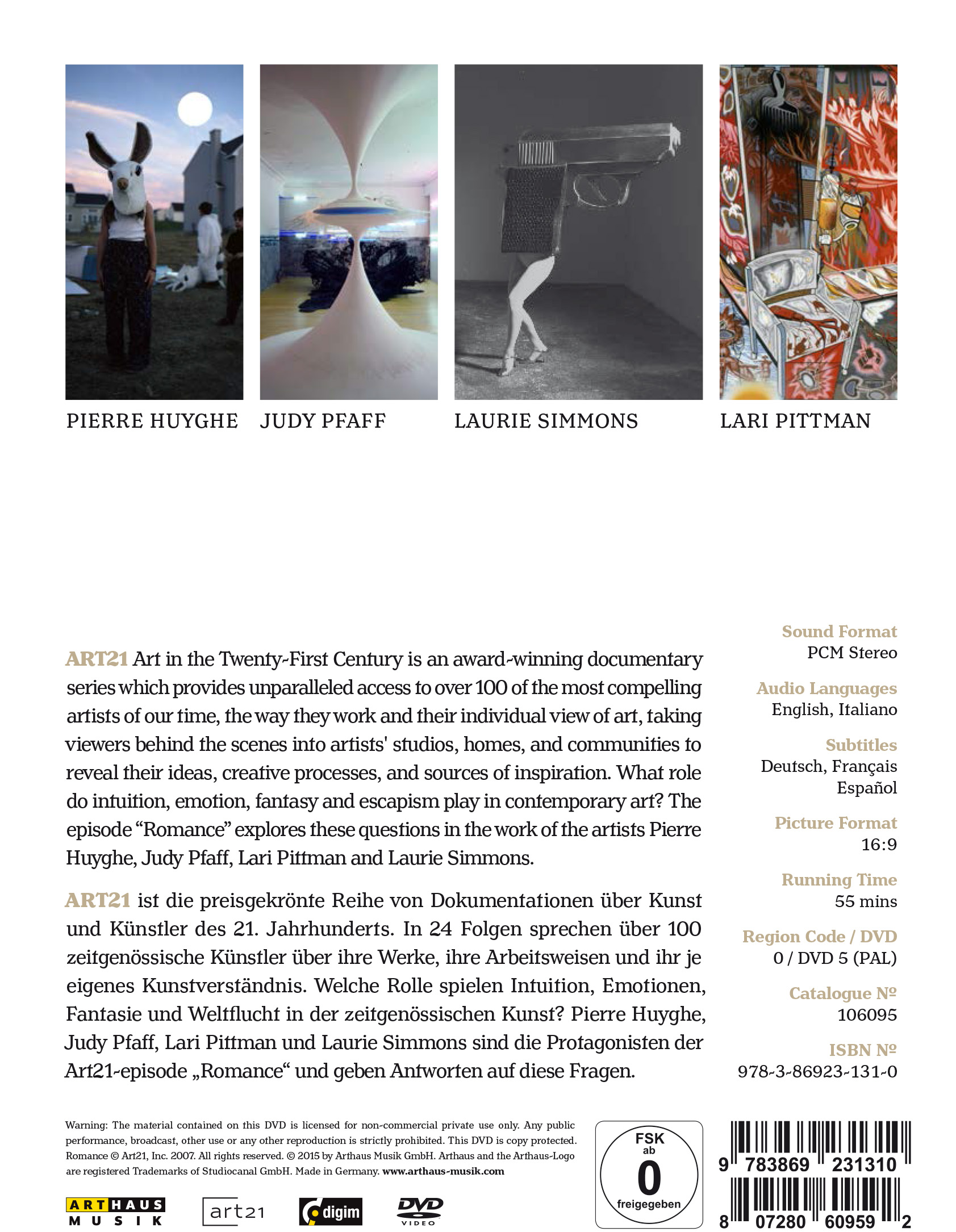 art21 ist die preisgekrönte Reihe von Dokumentationen über Kunst und Künstler des 21. Jahrhunderts. In 24 Folgen sprechen mehr als 100 zeitgenössische Künstler über ihre Werke, ihre Arbeitsweisen und ihr je eigenes Kunstverständnis. Welche Rolle spielen Intuition, Emotionen, Fantasie und Weltflucht in der zeitgenössischen Kunst? Pierre Huyghe, Judy Pfaff, Lari Pittman und Laurie Simmons sind die Protagonisten der art21-Episode "Romance" und geben Antworten auf diese Fragen.
