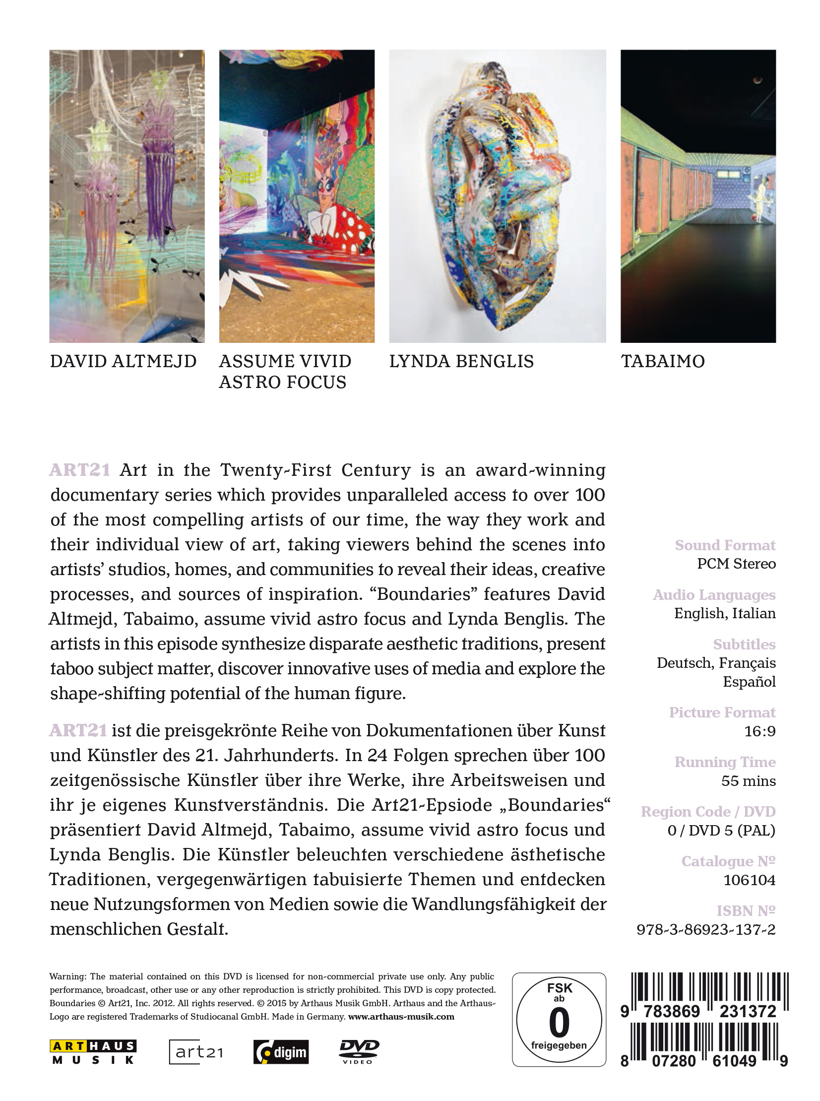 art21 ist die preisgekrönte Reihe von Dokumentationen über Kunst und Künstler des 21. Jahrhunderts. In 24 Folgen sprechen mehr als 100 zeitgenössische Künstler über ihre Werke, ihre Arbeitsweisen und ihr je eigenes Kunstverständnis. Die art21-Episode "Boundaries" präsentiert David Altmejd, Tabaimo, assume vivid astro focus und Lynda Benglis. Die Künstler beleuchten verschiedene ästhetische Traditionen, vergegenwärtigen tabuisierte Themen und entdecken neue Nutzungsformen von Medien sowie die Wandlungsfähigkeit der menschlichen Gestalt.