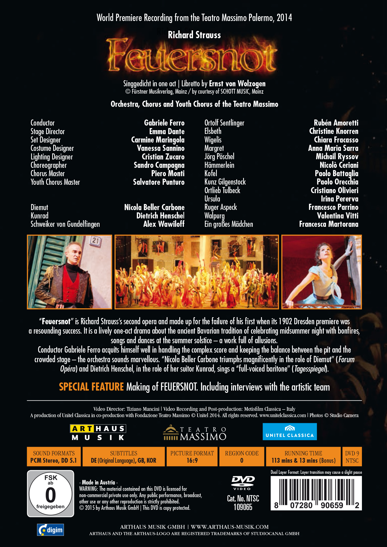 Feuersnot ist Richard Strauss' zweite Oper und machte mit ihrem durchschlagenden Erfolg bei der Premiere 1902 in Dresden den Reinfall seiner ersten Oper wieder wett. Der schwungvolle Einakter über die alte bayerische Tradition, die Sommersonnenwende mit Lagerfeuern, Liedern und Tänzen zu begehen ist ein Werk voller musikalischer Anspielungen. Die Partitur ist mit Zitaten von Wagner und Anklängen von Strauss'chen Zeitgenossen wie Mahler und Bruckner gespickt. Trotzdem ist die Oper durch und durch ein echter Richard Strauss von den rasanten Walzern bis hin zu den bezaubernden Liebesduetten.Der Dirigent Gabriele Ferro manövriert sich sicher durch die komplexe Partitur und hält die Balance zwischen dem Orchestergraben und der prächtig gefüllten Bühne das Orchester klingt einfach wunderbar. Nicola Beller Carbone brilliert großartig in der Rolle der Diemut (Forum Opéra) und Dietrich Henschel als ihr Verehrer Kunrad singt einen stimmgewaltigen Bariton (Tagesspiegel).