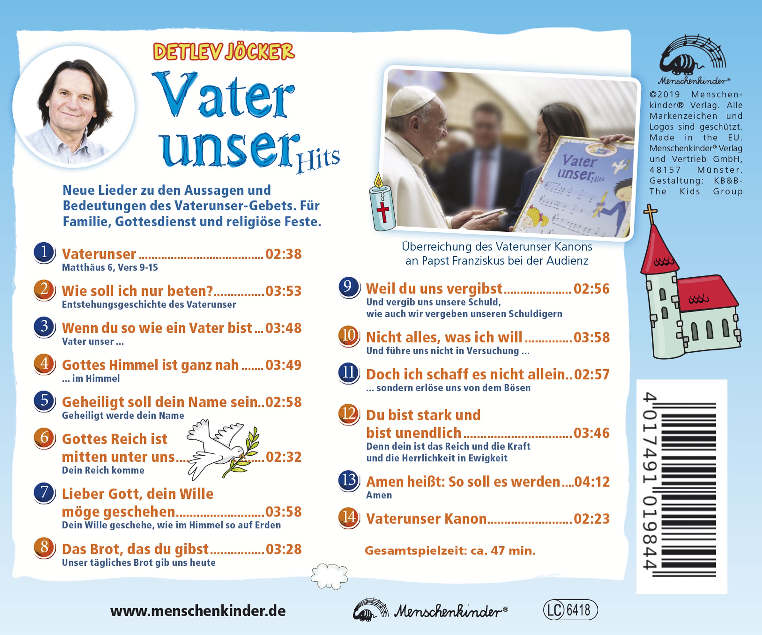 14 neue Werte- und Glaubenslieder rund um das Vaterunser Gebet für religiöse Feste, Familie, Gottesdienst, Religionsunterricht, Konfirmations-, Firmung- und Kommunionsvorbereitungen.