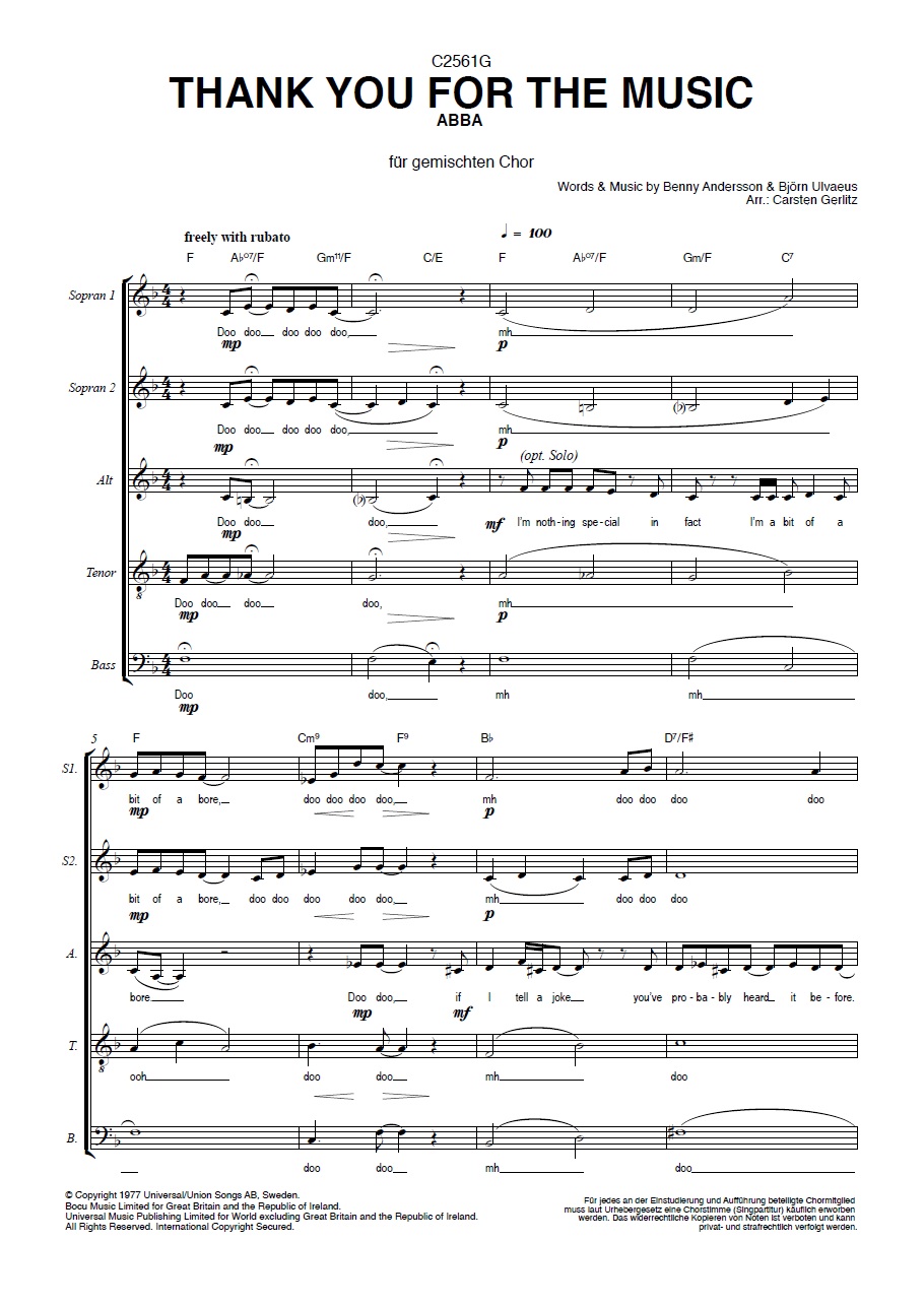 1978 veröffentlichte die schwedische Popgruppe ABBA ihre Lobeshymne auf die Musik als B-Seite einer Single: Thank You For The Music. Das Stück war als Teil des Mini-Musicals "The Girl With The Golden Hair" entstanden und wurde zunächst nur live gespielt. Als Studioversion von 1983 gilt der Song heute als absoluter Evergreen. Das vorliegende A Capella-Arrangement von Carsten Gerlitz führt zu den Wurzeln des Songs und überträgt die Originalvorlage detailreich auf einen fünfstimmigen Chor. Die Chormappe enthält die Singpartitur für SSATB in 10facher Ausführung.