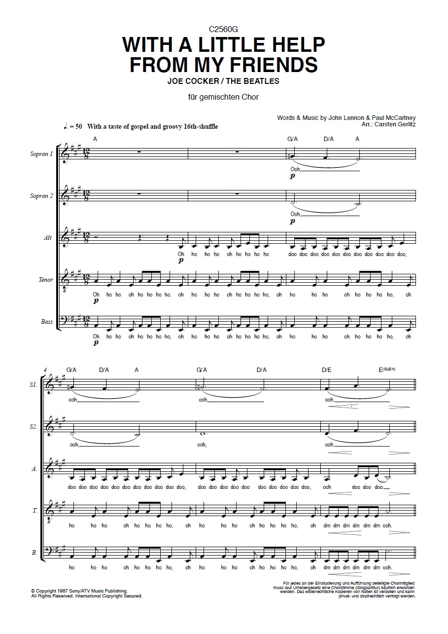 1967 nahmen die Beatles in den Abbey Road Studios With A Little Help From My Friends auf. Wie bereits auf anderen Platten sollte der Schlagzeuger Ringo Starr auch auf dem Album "Sgt. Pepper" einen Song singen. Um seinen begrenzten gesanglichen Fähigkeiten gerecht zu werden, komponierten John Lennon und Paul McCartney in nur wenigen Stunden einen Song, dessen Melodie bloß fünf Töne umfasst. Der Song inspirierte auch andere Interpreten zu diversen Coverversionen, darunter Joe Cocker, Wet Wet Wet, Bee Gees und Santana. Das A-Capella-Arrangement von Carsten Gerlitz legt diese Hymne auf die Freundschaft nun gemischten Chören in einem neuen Popgewand ans Herz und ans Stimmband. Die Chormappe enthält die Singpartitur für SSATB in 10facher Ausführung.