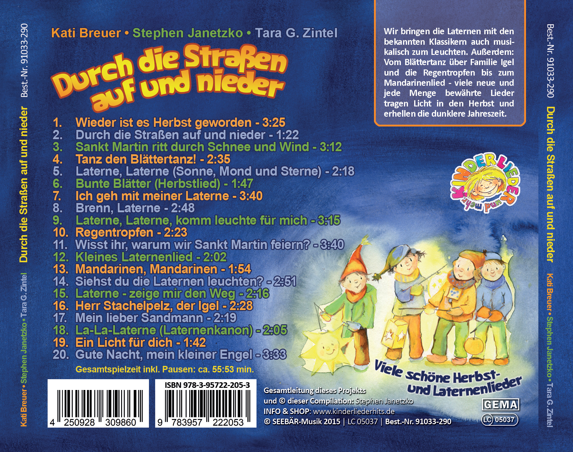 | Schlagworte | Blättertanz • Elke Bräunling • Fidula-Lieder • Geistliche, religiöse Musik • Herbst • Herbstlieder • Igel • Kati Breuer • Kinder, Jugendliche und Bildung • Kinderlieder • Kinder- und Jugendsachbuch: Musik • Komponisten und Liedermacher • Laterne • Laternelieder • Laternenlieder • Mandarinenlied • Martin von Tours / Sankt Martin (Heiliger); Lieder • Musikaufnahme und -wiedergabe, Technik • Regentropfen • Sankt Martin • Sankt Martin; Lieder • Seebär • Stephen Janetzko • Tara G. Zintel • Vorschule und Kindergarten |