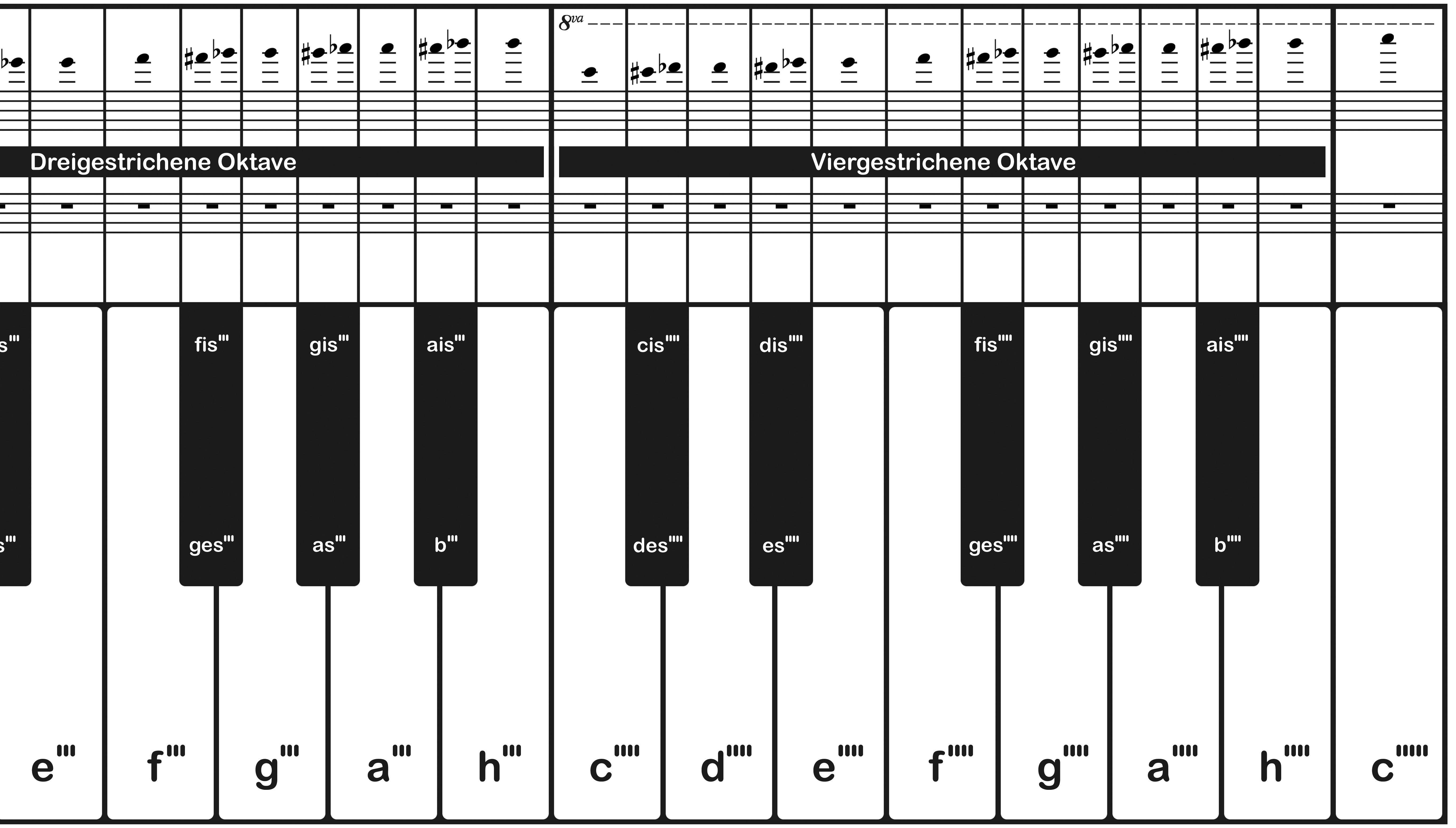 Ausklappbare Klaviertastatur mit 88 Tasten von A2 bis c5 – mit Notennamen, Notensystem & chromatischer Tonleiter (360g-Kartonpapier). Lernhilfe für Anfänger. Klaviernoten.