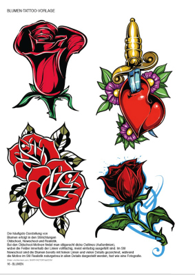 Auf 80 Seiten im Format A4, Softcover zeigt dieses Buch auf vielen Seiten 13 der wichtigsten Blumen, z.B. Rosen, Lotus, Hibiskus, Mohn usw. Nach einer jeweiligen Beschreibung der Blume und ihrer Bedeutungen folgen verschiedene Fotos der Originalblume, danach farbige Zeichnungen sowie teilweise Aquarelle und farbige Gemälde, und danach Outline-Zeichnungen. Damit ist für jedes Tattoo-Motiv die richtige Vorlage vorhanden.