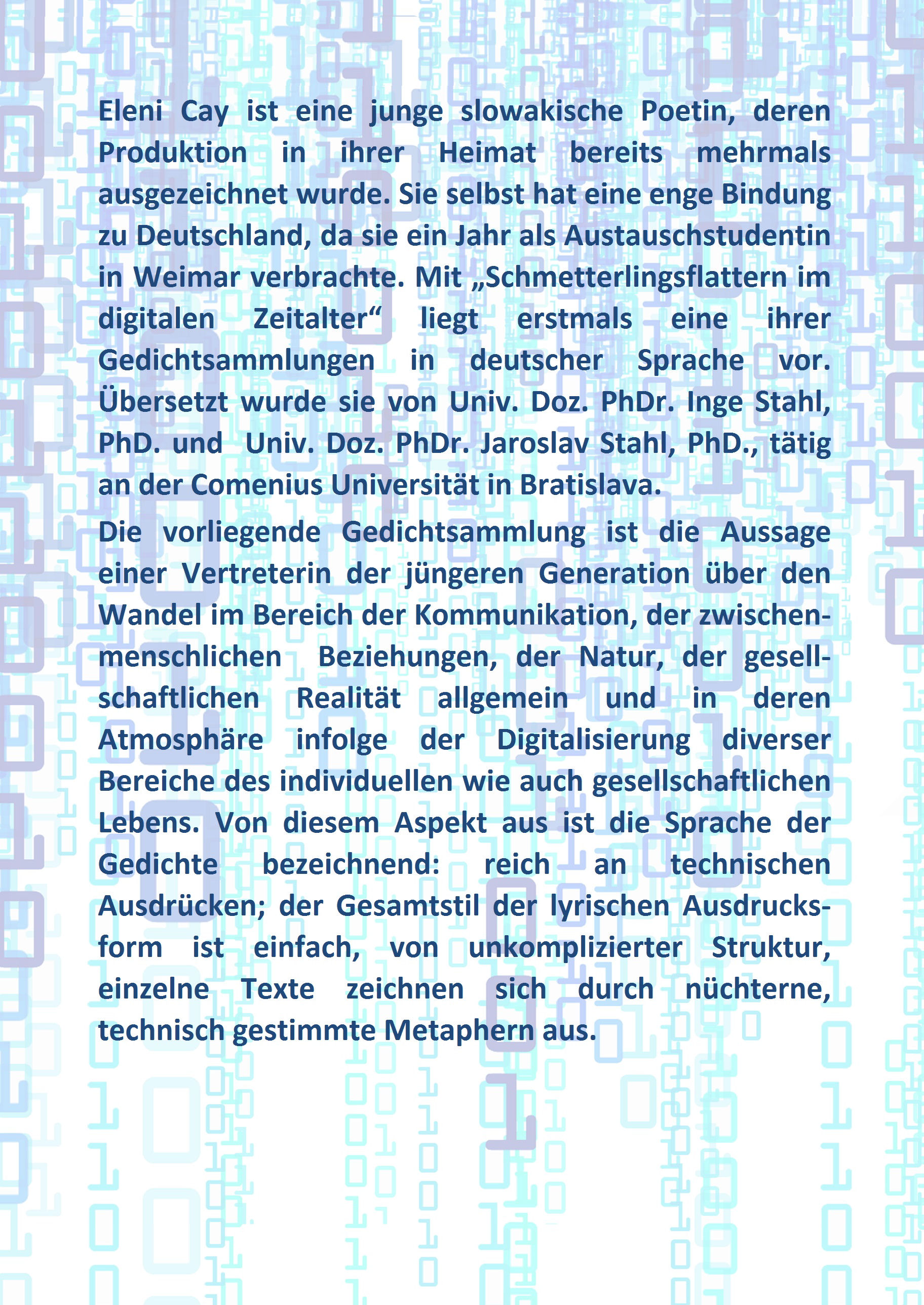 Eleni Cay ist eine junge slowakische Poetin, deren Produktion in ihrer Heimat bereits mehrmals ausgezeichnet wurde. Sie selbst hat eine enge Bindung zu Deutschland, da sie ein Jahr als Austauschstudentin in Weimar verbrachte. Mit „Schmetterlingsflattern im digitalen Zeitalter“ liegt erstmals eine ihrer Gedichtsammlungen in deutscher Sprache vor. Übersetzt wurde sie von Univ. Doz. PhDr. Inge Stahl, PhD. und Univ. Doz. PhDr. Jaroslav Stahl, PhD., tätig an der Comenius Universität in Bratislava.