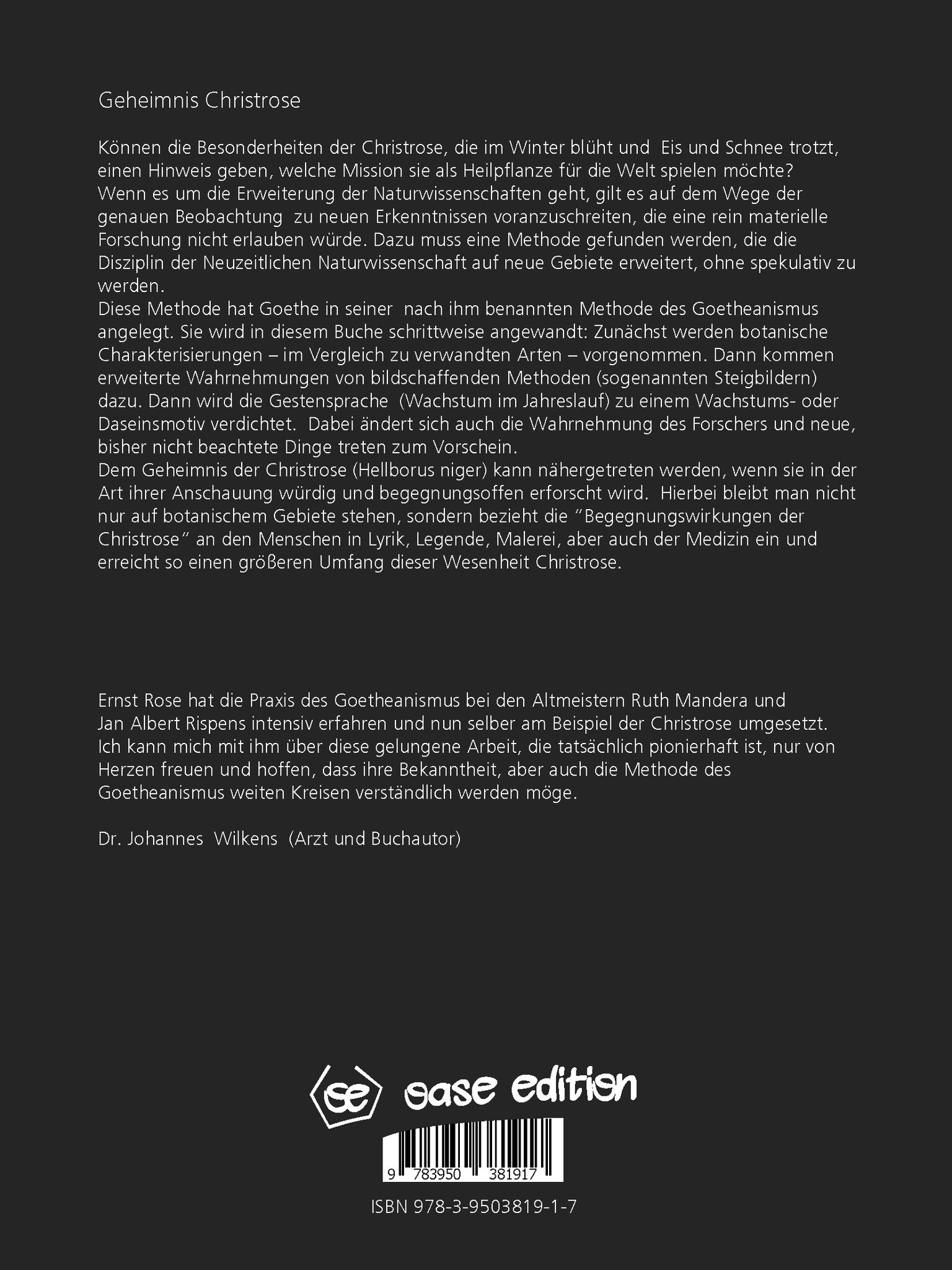 Vorwort (von Johannes Wilkens) Eine der bedeutendsten und faszinierendsten Pflanzen Europas ist die Christrose. Viele Jahrhunderte mühten sich Ärzte, ihr ihre Geheimnisse entlocken zu können. Doch erst in der Gegenwart scheint dieses wirklich möglich zu sein. Grundlage hierfür ist aber eine klare, wachsame und ruhige Beobachtung der Pflanze an sich im Jahreslauf, wie sie diese beispielhaft der Goetheanismus nach Rudolf Steiner lehrt. Ernst Rose hat die Praxis des Goetheanismus bei den Altmeistern Ruth Mandera und Jan Albert Rispens intensiv erfahren und nun selber am Beispiel der Christrose umgesetzt. Ich kann mich mit ihm über diese gelungene Arbeit, die tatsächlich pionierhaft ist, nur von Herzen freuen und hoffen, dass ihre Bekanntheit, aber auch die Methode des Goetheanismus weiten Kreisen verständlich werden möge. Mit herzlichen Grüßen Johannes Wilkens, Arzt und Buchautor