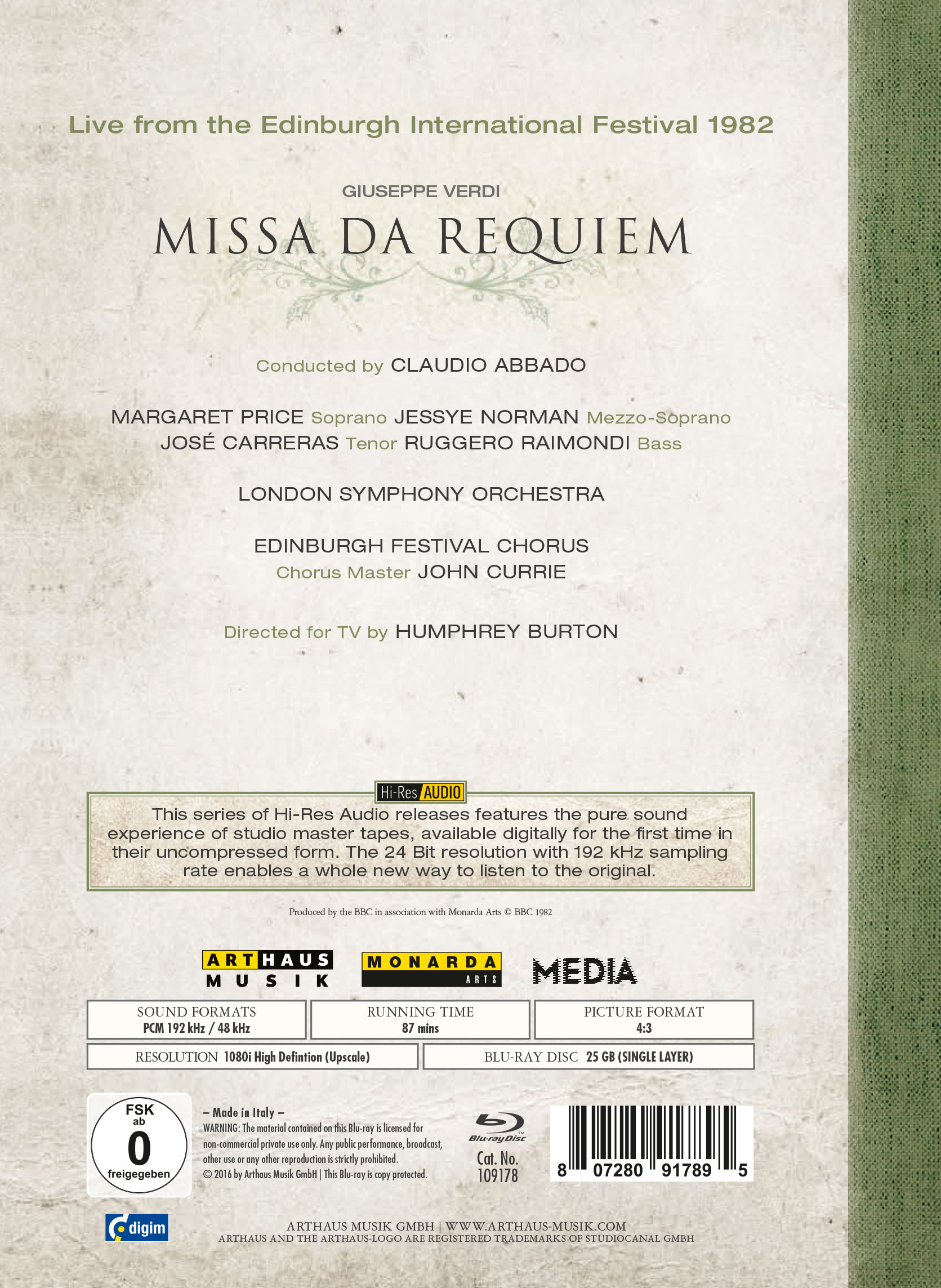 Der Tod von Alessandro Manzoni im Jahre 1873, für den Verdi eine fast religiöse Verehrung empfand, traf den damals schon als größter lebender Komponist Italiens verehrten Meister, der sich selbst gerade in einer schöpferischen Krise befand, schwer. Die Messa da Requiem ist zweifellos eine zutiefst persönliche Komposition Verdis, die die geheimsten Ängste des Verfassers in der Konfrontation mit seiner eigenen Sterblichkeit ausdrückt; gleichzeitig ist es aber auch ein höchst öffentliches Werk, durch das der Nationaldichter ebenso wie die ganze italienische Seele geehrt werden sollte in einer musikalischen Sprache, welche die großartige Tradition italienischer Musik und italienischer Kultur verkörperte, deren Verschwinden Verdi damals zu erblicken glaubte. Die denkwürdige Aufführung aus der Usher Hall in Edinburgh 1982 mit dem London Symphony Orchester und den erstklassigen Sängern Jessye Norman, Margaret Price, José Carreras und Ruggero Raimondi steht unter der Leitung des legendären Claudio Abbado.