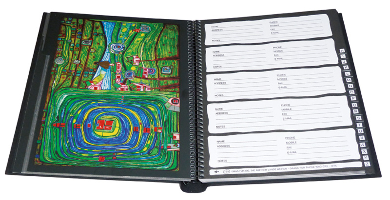 | Schlagworte | Adressbuch • Adressbuch (Papeterie) • Hundertwasser • Hundertwasser Adressbuch • Hundertwasser, Friedensreich; Nonbooks • Hundertwasser, Friedensreich; Papeterie |