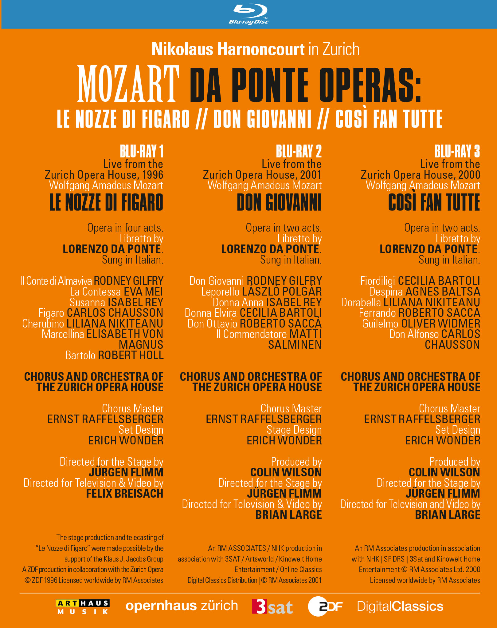 His first opera production dates from 1971, when he conducted Monteverdi‘s “Il ritorno d‘Ulisse in patria” at the Theater an der Wien, and soon after this he embarked on a fruitful cooperation with Jean-Pierre Ponnelle at the Zurich Opera. Harnoncourt has maintained his close connection with the Zurich Opera to this day. Arthaus Musik presents two of his legendary Zurich productions in this unique Opera Collection. Staged by the famous director Jürgen Flimm, with renowned stars of the opera scene as Cecilia Bartoli, Rodney Gilfry, Liliana Nikiteanu and Roberto Saccà, this recordings are true highlights of Maestro Harnoncourt‘s work. Der im März dieses Jahres verstorbene Nikolaus Harnoncourt war einer der wenigen wirklichen Weltstars unter den Dirigenten. Mit Leidenschaft und flammendem Ernst begeisterte er ein Millionenpublikum und war vor allem eines: ein wahrer Diener der Kunst. Das außergewöhnlich kreative Team aus dem Dirigenten Nikolaus Harnoncourt, dem Regisseur Jürgen Flimm, dem Bühnenbildner Erich Wonder und der Kostümbildnerin Florence von Gerkan führte am Zürcher Opernhaus alle drei Bühnenwerke Mozarts auf, die der Komponist einst mit Lorenzo da Ponte schuf. Die exklusive Opernkollektion vereint nun Don Giovanni, Così fan tutte und Le nozze di Figaro und hält das künstlerische Wirken des Dirigenten am Opernhaus Zürich am Leben. Mit erstklassigen Stars der Opernszene wie Cecilia Bartoli, Rodney Gilfry, Liliana Nikiteanu und Roberto Saccà sind diese Aufnahmen Höhepunkte im Schaffen von Maestro Harnoncourt.