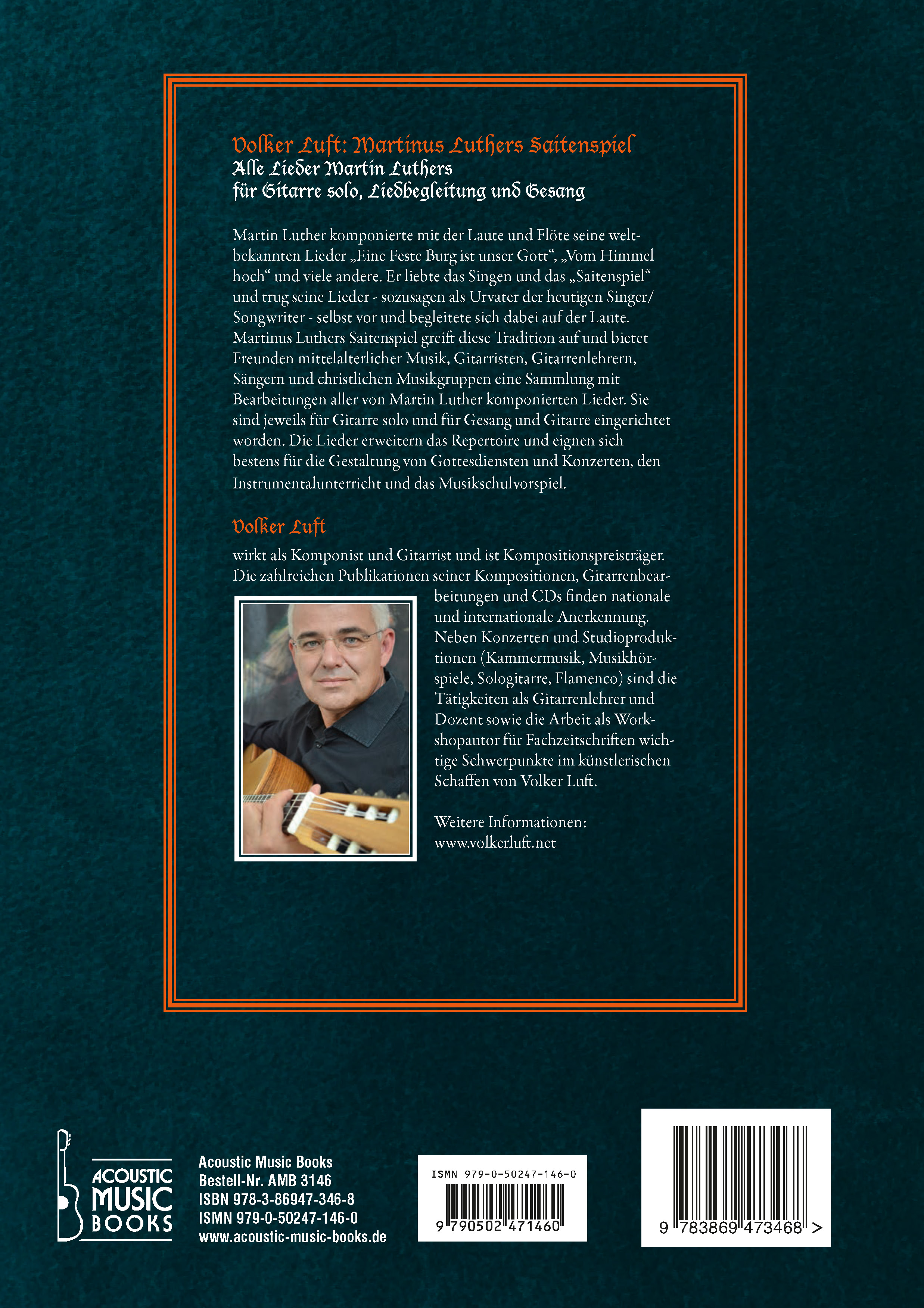 Martinus Luthers Saitenspiel grei diese Tradition auf und bietet Freunden mittelalterlicher Musik, Gitarristen, Gitarrenlehrern, Sängern und christlichen Musikgruppen eine Sammlung mit Bearbeitungen aller von Martin Luther komponierten Lieder. Sie sind jeweils für Gitarre solo und für Gesang und Gitarre eingerichtet worden. Die Lieder erweitern das Repertoire und eignen sich bestens für die Gestaltung von Gottesdiensten und Konzerten, den Instrumentalunterricht und das Musikschulvorspiel.