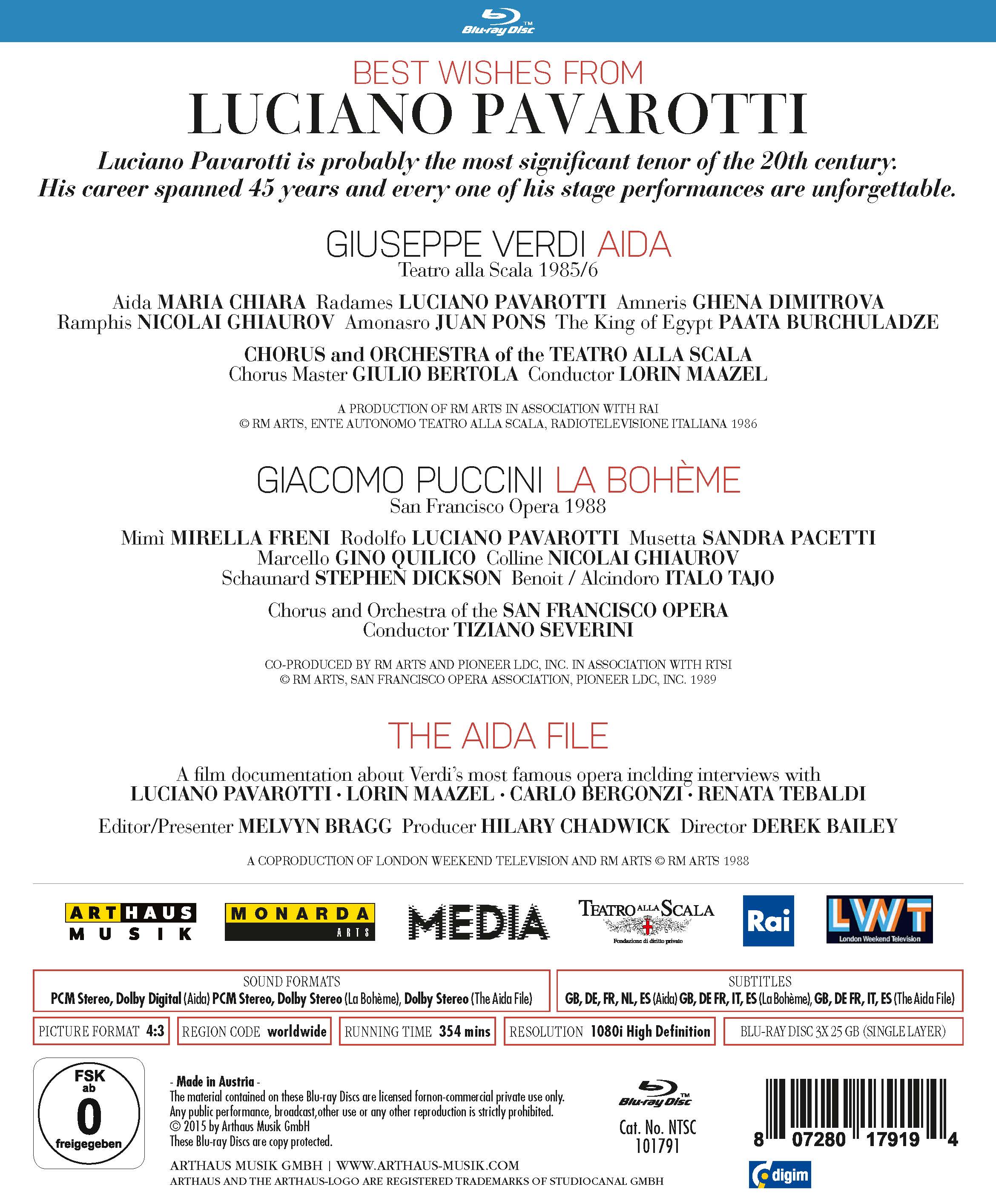 Luciano Pavarotti, der am 12. Oktober seinen 80. Geburtstag feiern würde, ist wahrscheinlich der bedeutendste Tenor des 20. Jahrhunderts. Seine Karriere erstreckte sich über 45 Jahre und zahlreiche unvergessliche Opernauftritte, darunter Puccinis La Bohème und Turandot und Verdis Aida. Zwei dieser fantastischen Vorführungen präsentiert Arthaus Musik auf DVD und Blu-ray in einer exquisiten Box: Aida von 1985 aus der Mailänder Scala und La Bohème, 1988 aus der San Francisco Opera, mit Mirella Freni, der einzig wahren Mimi. Als Bonus gibt The Aida File mit Luciano Pavarotti, Carlo Bergonzi, Grace Bumbry und anderen, gibt Einblicke in die Arbeiten zu Giuseppe Verdis berühmtester Oper.