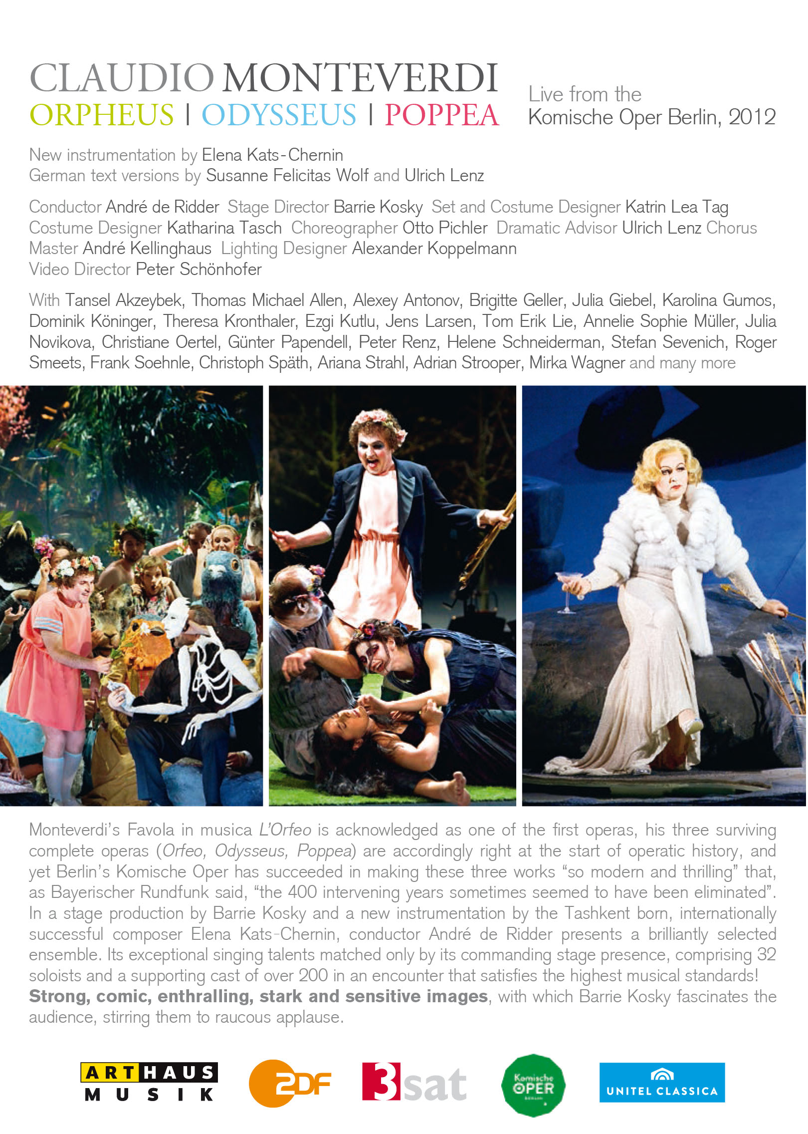 Monteverdis Opern gelten zu Recht als die ersten Meisterwerke der Operngeschichte. Ähnlich einer DNA sind in ihnen alle Merkmale der modernen Oper enthalten. Elena Kats-Chernin, eine international erfolgreiche Komponistin aus Taschkent, nahm Monteverdis musikalisches Material, obwohl es nur eine vage Orchesterfassung beinhaltete, und schuf eine neue und eigenwillige Instrumentation. Ähnlich wie Monteverdi vor 400 Jahren verwebt Kats-Chernin verschiedene Stile von Jazz und Klezmer über Tango und Ragtime zu ihrem eigenen Stil. Diese Neuschöpfung der Monteverdi-Opern würzt die traditionelle Orchestrierung mit exotischen Instrumenten aus Osteuropa, dem Nahen Osten und Westafrika. Starke, komische, packende, krasse und sensible Bilder, mit denen Barrie Kosky das Publikum fasziniert und zu donnerndem Applaus bewegt.