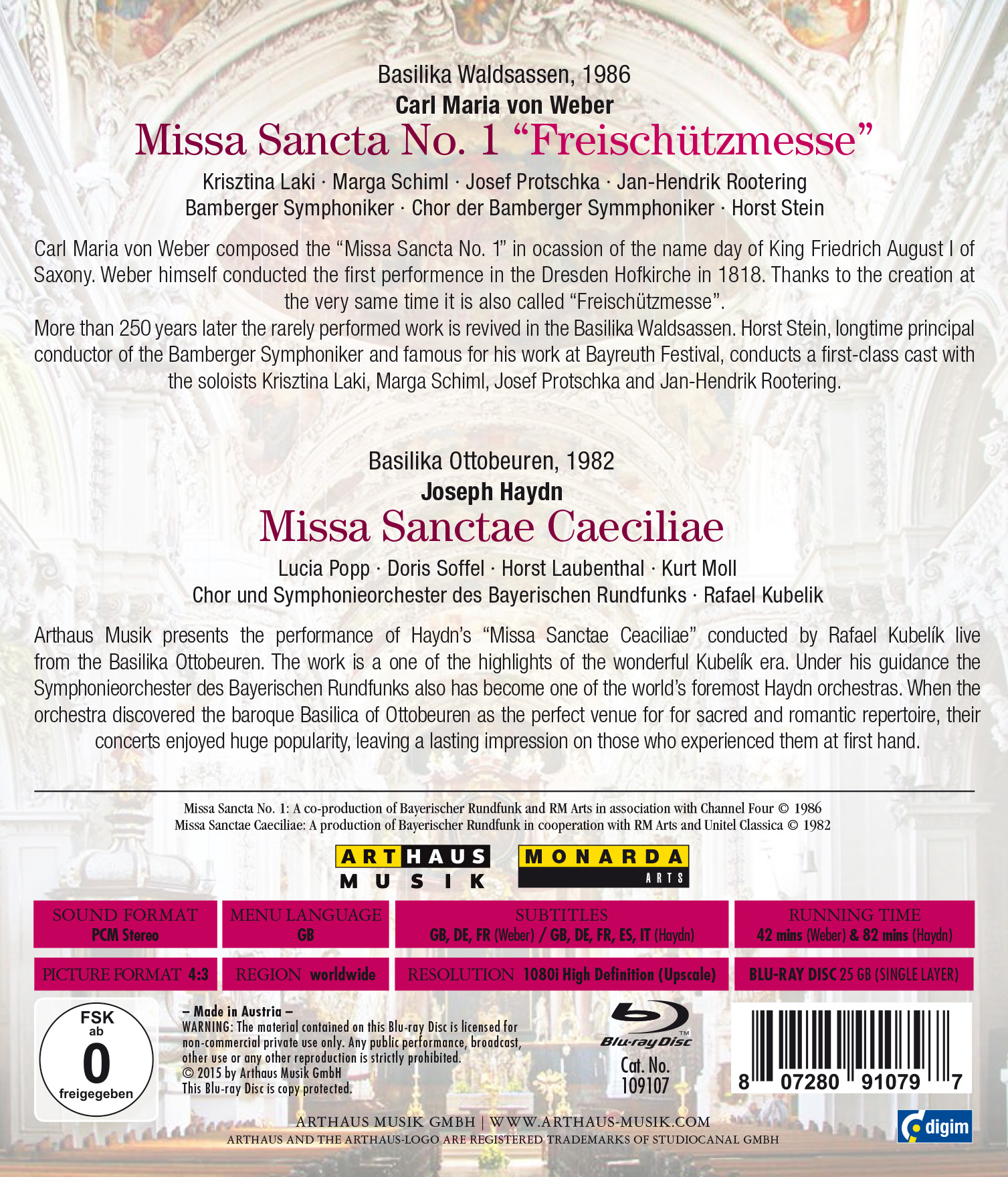 Carl Maria von Weber komponierte die "Missa Sancta No. 1" anlässlich des Namenstages von König Friedrich August I. von Sachsen. Weber persönlich dirigierte 1818 die Premiere in der Dresdner Hofkirche. Da er zur selben Zeit die Arbeit an seinem "Freischütz" begonnen hatte, bekam die Messe den Beinamen "Freischützmesse". Mehr als 250 Jahre später wird das selten aufgeführte Werk in der Basilika Waldsassen gespielt. Horst Stein, langjähriger musikalischer Leiter der Bamberger Symphoniker und berühmt für seine Arbeit bei den Bayreuther Festspielen, dirigiert eine erstklassige Besetzung mit den Solisten Krisztina Laki, Marga Schiml, Josef Protschka und Jan-Hendrik Rootering. Arthaus Musik präsentiert die Aufführung von Haydns "Missa Sanctae Caeciliae", live aus der Basilika Ottobeuren unter der musikalischen Leitung von Rafael Kubelík. Das Werk ist eines der Highlights der großartigen Kubelík-Ära. Unter seiner Leitung wurde das Symphonieorchester des Bayerischen Rundfunks zu einem der weltbesten Haydn-Orchester. Das Orchester hatte die barocke Basilika in Ottobeuren als den perfekten Schauplatz für sakrales und romantisches Repertoire auserkoren. Seine Konzerte dort erfreuten sich großer Beliebtheit und hinterließen, bei denen, die sie live erleben konnten, einen bleibenden Eindruck.