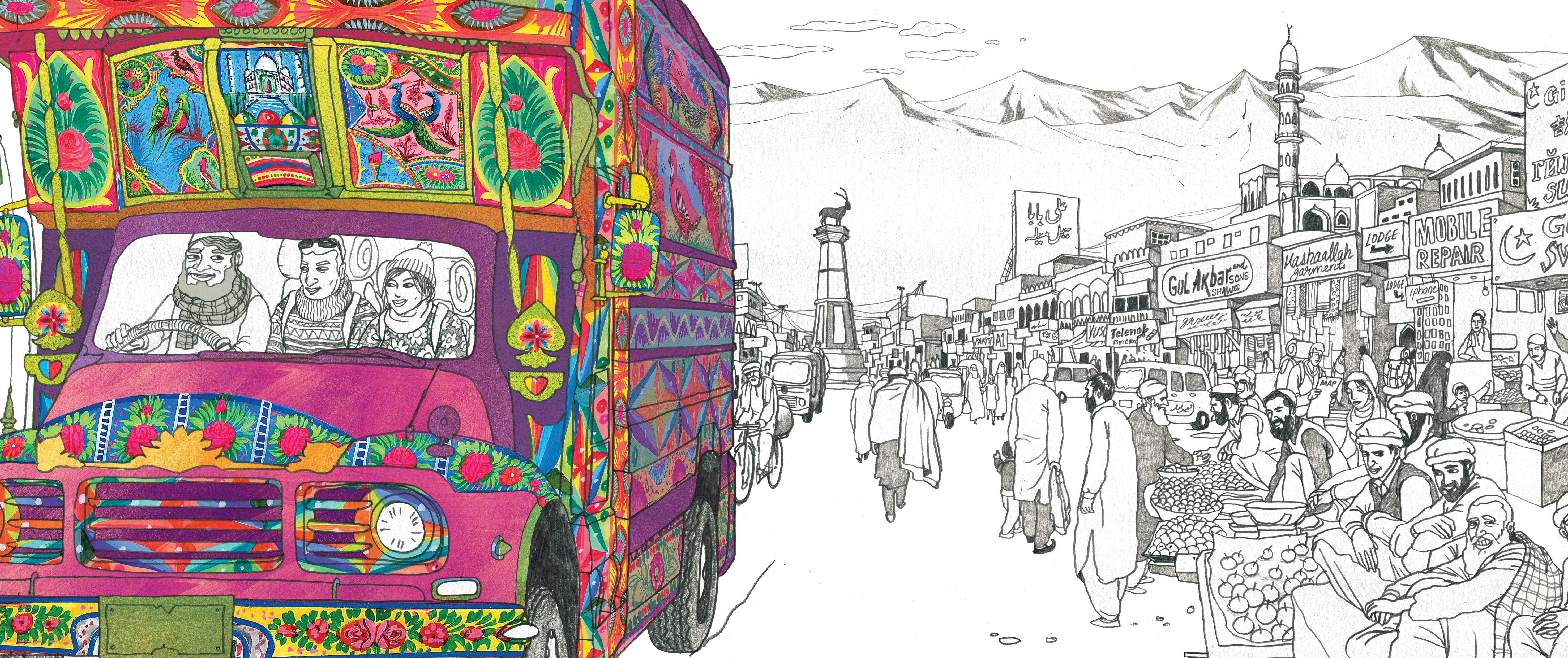 Anjum Rana is a Pakistan-based interior designer who works with truck artists on furniture, walls, household objects as well as objects d'art. Through the initiative Tribal Truck Art, she has helped develop opportunities and contexts for truck artists to practice their craft in sustainable ways. She is committed to bringing this art into mainstream cultural life and give it the recognition that it so richly deserves. Anjum Rana is a recipient of the UNESCO Seal of Excellence in Handicrafts Award in 2008. Hakeem Nawaz and Amer Khan are truck artists who work closely with Anjum Rana. They were trained from their early teenage years by elders in their family, and today are acknowledged masters of the art form. In the art projects they undertake with Anjum, they have retained their original brush-strokes, but have also grown adept at drawing on smaller surfaces as larger ones. Illustrator and designer Sameer Kulavoor lives in Mumbai, India. His work lies in the intersection of graphic design, contemporary illustration and art -- and he has his own studio, Bombay Duck Designs. He publishes artbooks and zines which feature characteristic mannerisms and images of urban life, design and culture.