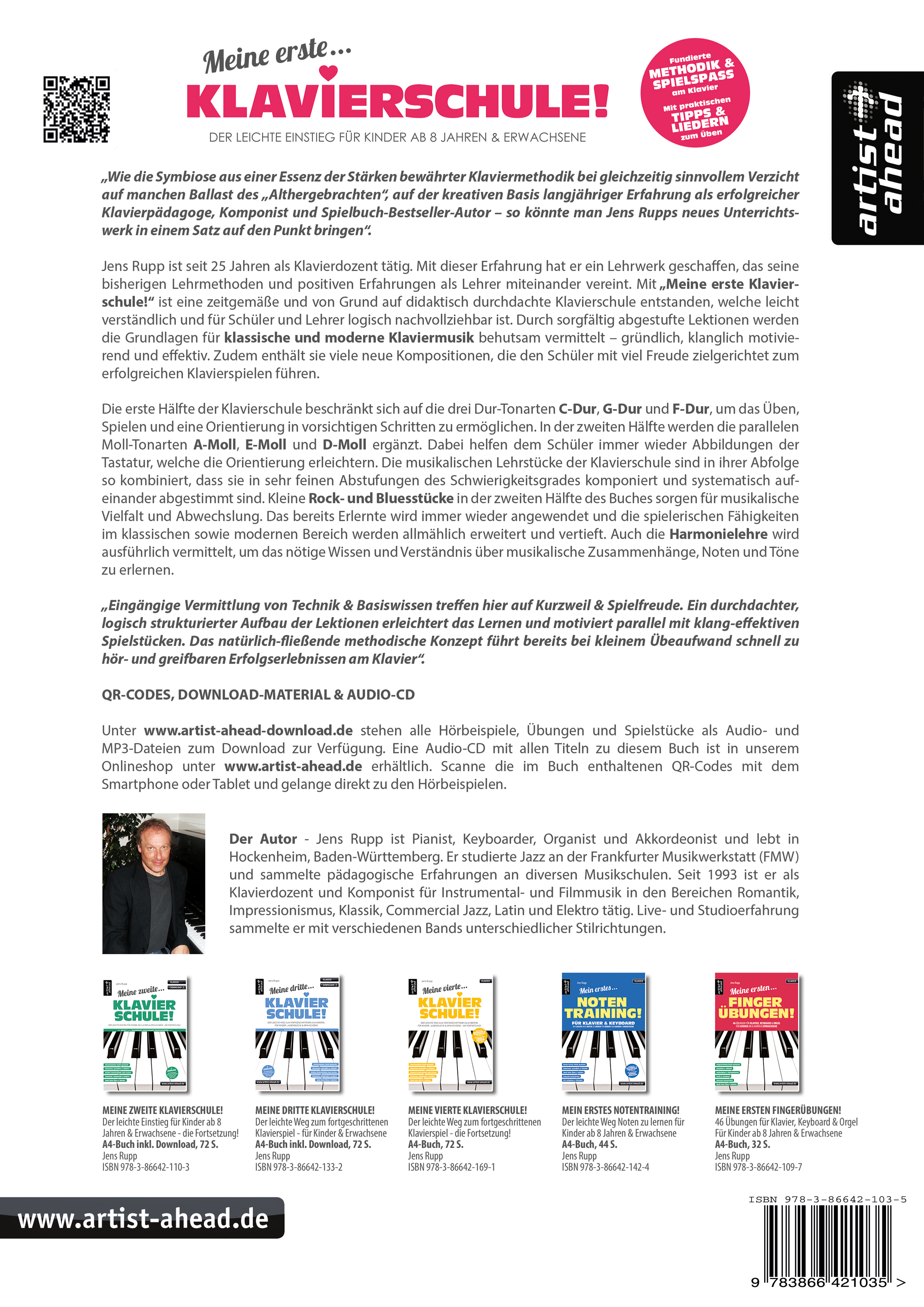 Jens Rupp ist seit 30 Jahren als Klavierdozent tätig. Mit dieser Erfahrung hat er nun ein Lehrwerk geschaffen, das seine bisherigen Lehrmethoden und positiven Erfahrungen als Lehrer miteinander vereint. Mit "Meine erste Klavierschule!" ist eine zeitgemäße und von Grund auf didaktisch durchdachte Klavierschule entstanden, welche leicht verständlich und für Schüler und Lehrer logisch nachvollziehbar ist. Durch sorgfältig abgestufte Lektionen werden die Grundlagen der klassischen und modernen Klaviermusik behutsam vermittelt - gründlich, klanglich motivierend und effektiv. Zudem enthält sie viele neue Kompositionen, die den Schüler mit viel Freude zielgerichtet zum erfolgreichen Klavierspielen führen.