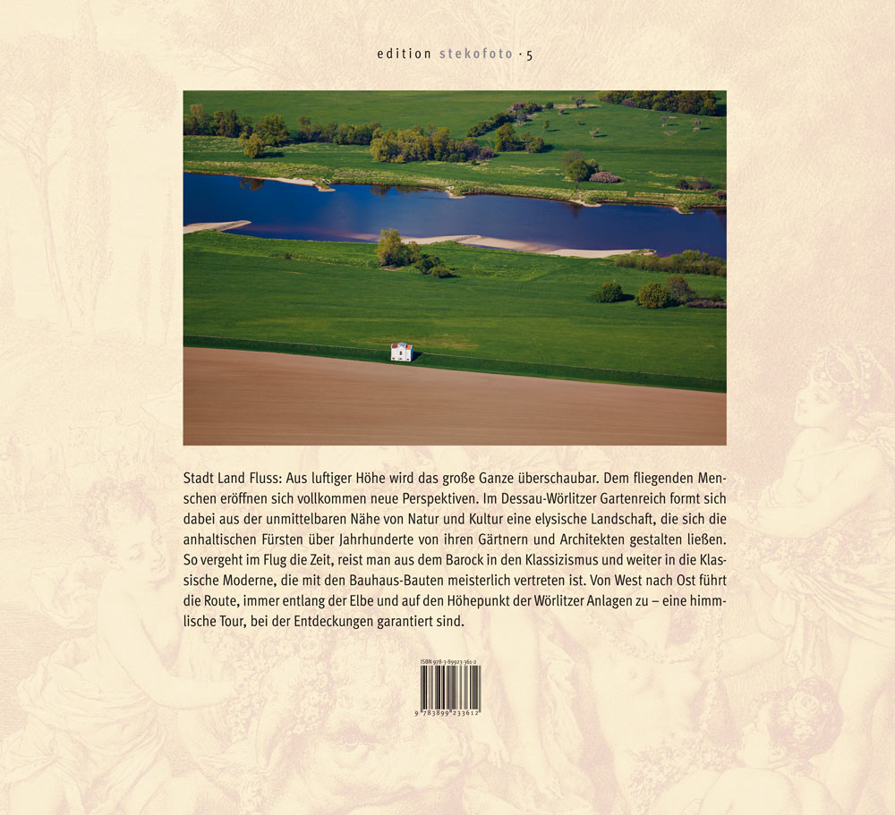 Mosigkau, Großkühnau, Dessau-Roßlau, Sieglitzer Berg, Oranienbaum, Wörlitz, die beiden Flüsse Elbe und Mulde. Was für eine Kulturlandschaft! Im anhaltischen Gartenreich wird die sorgfältig gestaltete Landschaft nach Epochen gemessen: Von der barocken Anlage in Oranienbaum, die das dreiflügelige Schloss seit dem späten 17. Jahrhundert in der ihm gegenüberliegenden Stadt spiegelt, reicht das Spektrum bis zu den idyllischen Refugien des Luisiums und des Georgiums, die rund hundert Jahre später entstanden. Daneben sind die Schlösser und Gärten von Mosigkau und Großkühnau zu finden sowie natürlich vor allem die weitläufigen Wörlitzer Anlagen, auf deren Gestaltung Fürst Leopold III. Friedrich Franz von Anhalt-Dessau mit seinen wechselnden Gärtnern ab 1764 mehr als dreieinhalb Jahrzehnte verwandte. Wo sonst könnte man auf so engem Raum den Wechsel vom barocken Stil französischer Prägung hin zum englischen Landschaftsgarten bewundern? Stadt, Land, Fluss: So aus luftiger Höhe wurde das große Ganze dieser gleich dreifach als UNESCO Weltkulturerbe geschützten Gegend noch nie gesehen. In heutigen Zeiten der allgemeinen Verfügbarkeit von Satelliten-Aufnahmen, die das Banale unterschiedslos neben dem Erlesenen zeigen, kommt dem geschulten Blick des Fotografen entscheidende Bedeutung zu. Dann eröffnen sich dem fliegenden Menschen vollkommen neue Perspektiven. Im Dessau-Wörlitzer Gartenreich formt sich dabei aus der unmittelbaren Nähe von Natur und Kultur eine elysische Landschaft, die sich die anhaltischen Fürsten über Jahrhunderte von ihren Gärtnern und Architekten gestalten ließen. Hier vergeht im Flug die Zeit, reist man aus dem Barock in den Klassizismus und weiter in die Klassische Moderne, die mit den Bauhaus-Bauten meisterlich vertreten ist. Von West nach Ost führt die Route, immer entlang der Elbe und auf den Höhepunkt der Wörlitzer Anlagen zu - eine himmlische Tour, bei der Entdeckungen garantiert sind.