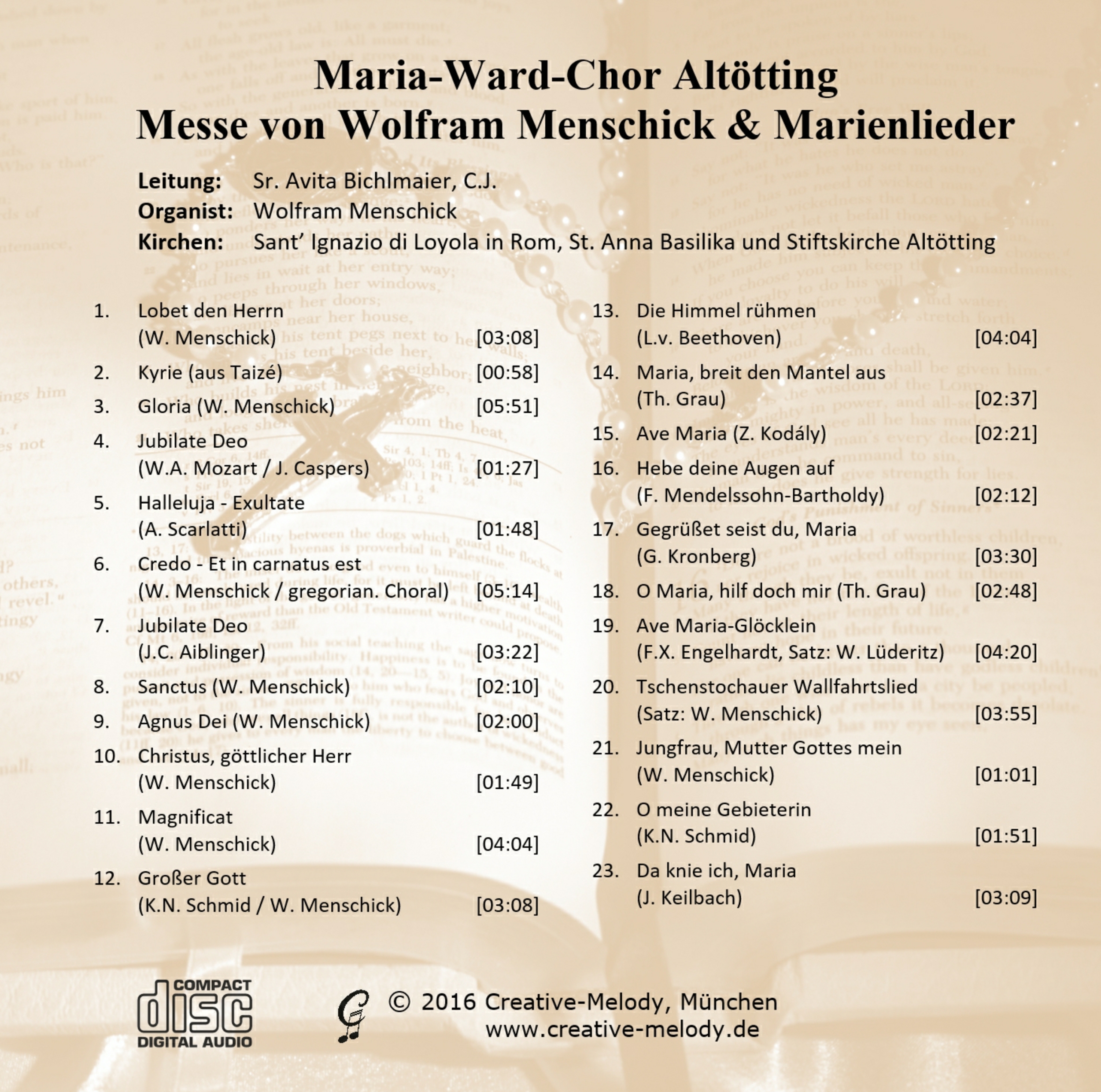 Bekannte und beliebte Marienlieder sind hier mit einer speziell für den Chor komponierten Messe von Wolfram Menschick auf der CD aus Live-Aufnahmen des Maria-Ward-Chores Altötting zusammengestellt.