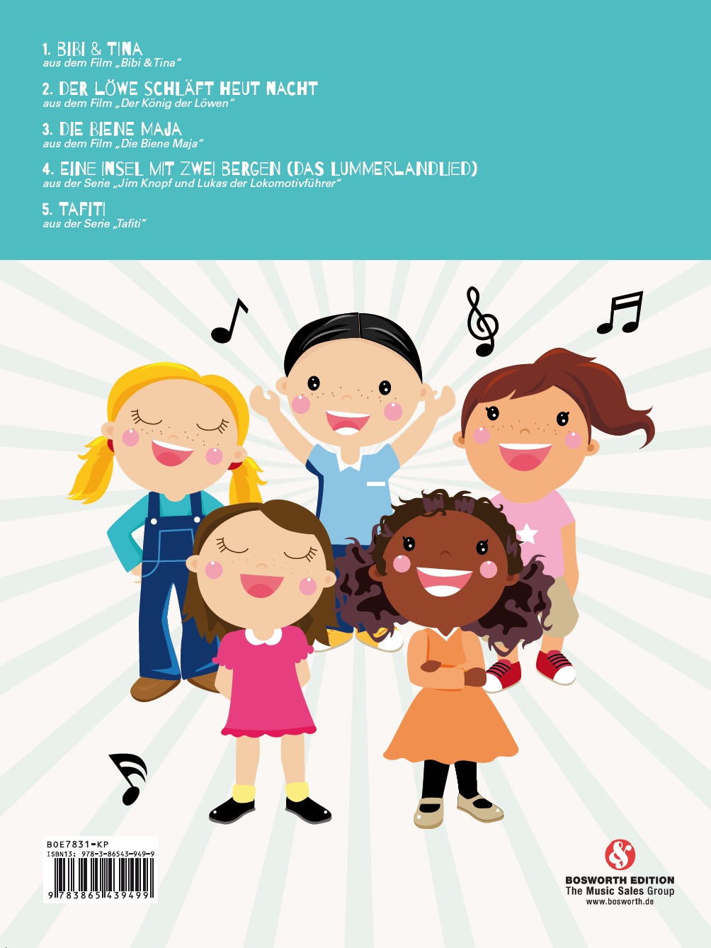 Unsere Reihe Der kleine Kinderchor richtet sich an Kinder im Grundschulalter, um deren Freude an der Musik und am Singen zu wecken und zu fördern. Jeder Band enthält fünf bekannte Lieder. Jeder Song ist ein übersichtliches, nachvollziehbares, zweistimmiges Chorarrangement mit Liedtext. Die Arrangements sind für Schulklassen, für kleine Gruppen oder auch für das Singen zu Hause geeignet.////Dieses Heft enthält die Klavier-Arrangements aller Stücke und eine Audio-CD mit der Klavierbegleitung. Sie können also entweder selbst spielen oder spielen lassen.////Die Singpartitur zu Band 1 ist separat unter der Artikelnummer BOE7831 erhältlich.////Inhalt://1. Bibi & Tina (aus dem Film "Bibi & Tina")//2. Der Löwe schläft heut Nacht (aus dem Film "Der König der Löwen")//3. Die Biene Maja (aus dem Film "Die Biene Maja")//4. Ein Insel mit zwei Bergen (Das Lummerlandlied) (aus der Serie "Jim Knopf und Lukas der Lokomotivführer")//5. Tafiti (aus der Serie "Tafiti")