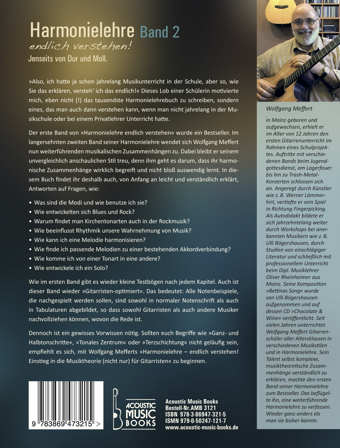 Wolfgang Meffert, in Mainz geboren und aufgewachsen, erhielt er im Alter von 12 Jahren den ersten Gitarrenunterricht im Rahmen eines Schulprojektes. Auftritte mit verschiedenen Bands beim Jugendgottesdienst, am Lagerfeuer bis hin zu Trash-Metal-Konzerten schlossen sich an. Angeregt durch Künstler wie z. B. Werner Lämmerhirt, vertiefte er sein Spiel in Richtung Fingerpicking. Als Autodidakt bildete er sich jahrzehntelang weiter durch Workshops bei anerkannten Musikern wie z. B. Ulli Bögershausen, durch Studien von einschlägiger Literatur und schließlich professionellem Unterricht beim Dipl. Musiklehrer Oliver Rheinheimer aus Mainz. Seine Komposition „Bettinas Song“ wurde von Ulli Bögershausen aufgenommen und auf dessen CD „Chocolate & Wine“ veröffentlicht. Seit vielen Jahren unterrichtet Wolfgang Meffert Gitarrenschüler aller Altersklassen in verschiedenen Musikstilen und in Harmonelehre. Sen Talent, selbst komplexe musiktheoretische Zusammenhänge verständlich zu erklären, machten den ersten Band seiner Harmonielehre zum Bestseller. Das beflügelte ihn, eine weiterführende Harmonielehre zu verfassen. Wieder ganz anders als man sie bisher kannte.