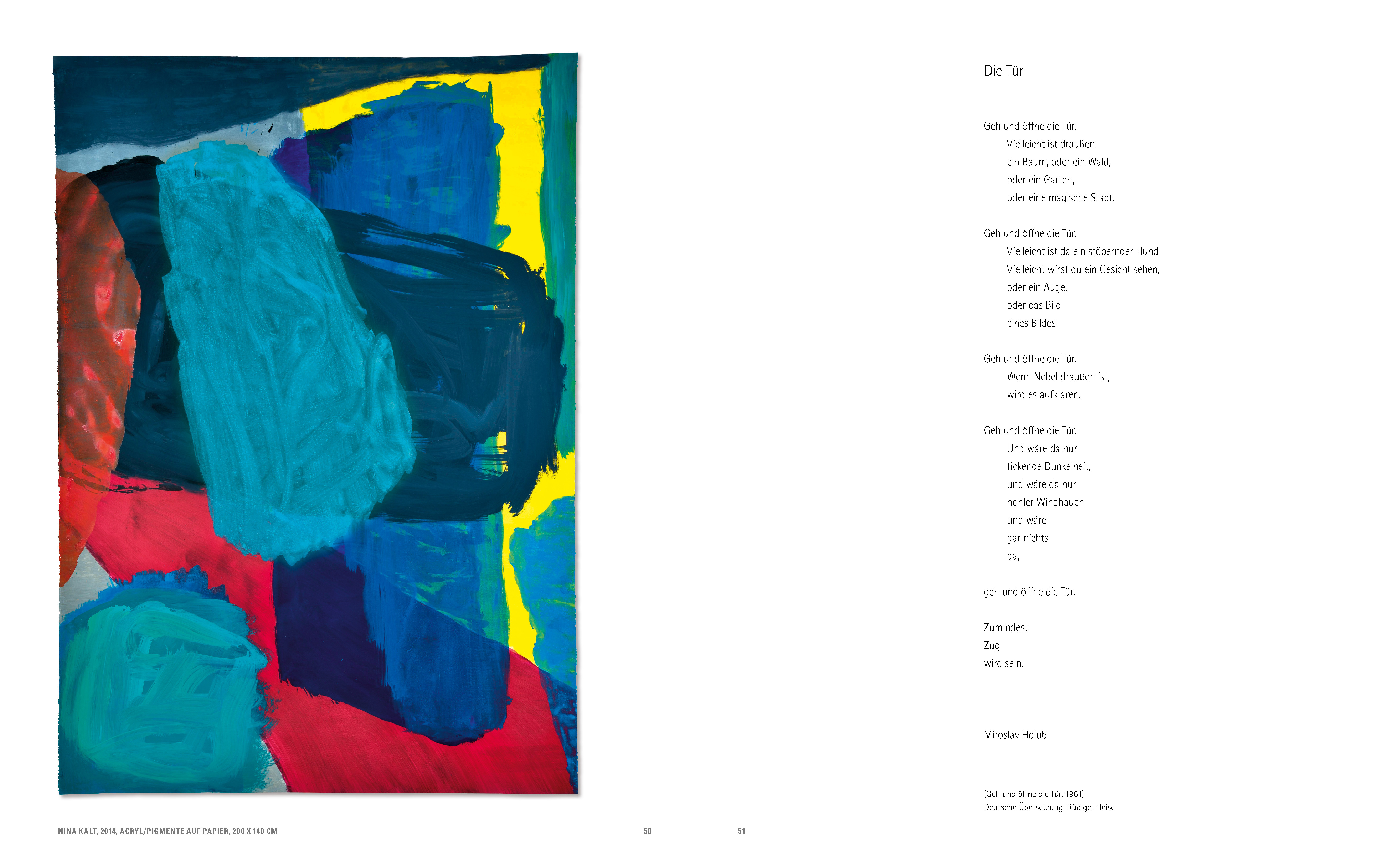 Kontinental unterwegs Freundschaften, die nationale und kontinentale Grenzen überwanden, und das glückhafte Spiel aus Zufall und Notwendigkeit bestimmen dieses Projekt. Dass das Projekt jetzt in seine vierte Phase eintritt, war zu Beginn nicht absehbar und schon gar nicht beabsichtigt. Dennoch ergibt sich aus dem überschauenden Rückblick von fünf Jahren, dass die einzelnen Phasen keineswegs rein zufällig aufeinander gefolgt sind. Es waltete eine Notwendigkeit, die gar nicht immer allen Beteiligten im Moment des Handelns klar vor Augen stand, sich aber im Blick zurück umso offenbarer entfaltet hat. Nach fünf Jahren gemeinsamer Arbeit am Projekt entschloss sich Nina Kalt, den Verlauf des Projekts jetzt in einer Buchpublikation zu dokumentieren. Die Publikation trägt den Titel „Kontinental unterwegs“. Dieser Titel umfasst drei Bedeutungen: Zum einen verweist er darauf, dass die Beteiligten an diesem Projekt über reale Kontinente – Asien und Europa – verbunden, aber eben auch geografisch und kulturell getrennt sind. Über Ausbildungsjahre und Arbeitsaufenthalte ist auch Amerika als Kontinent mit vertreten. Des Weiteren ergibt sich eine Bedeutungsfacette aus der Herkunft des Wortes Kontinent aus dem lateinischen Tätigkeitswort „continere“, das mit „zusammenhalten“ zu übersetzen wäre. Dass sich die geografischen Entfernungen der Kontinente im Arbeitsfortgang zu keinem Hindernis entwickelt haben, ist dem besonderen Zusammenhalt aller Beteiligten zu verdanken. Ein dritter Bedeutungsaspekt des Titels leitet sich aus der nicht gegenständlichen Darstellungsweise der Malenden her. Auf ihren Leinwänden und Papierbahnen driften die einzelnen Farbflächen gleich wie die Kontinente auf der Erdoberfläche daher. Wie bei der Kontinentaldrift folgt aber auch die Drift der Farbflecken auf dem Trägermedium unterschwelligen, eben nicht sichtbaren Gesetzmäßigkeiten. Anlässlich der Dokumentation des bis jetzt erreichten Projektstands in Buchform ist es an dieser Stelle durchaus sinnvoll, etwas über die Anfänge vor dem Projektbeginn zu berichten und kurz die handelnden Persönlichkeiten vorzustellen. Nina Kalt zeigte in ihrer Galerie im Westen Münchens Werke des tschechischen Künstlers Patrik Hábl. Das Verhältnis zwischen Künstler und Galeristin vertiefte sich bald zu einer Freundschaft, nicht zuletzt erleichtert dadurch, dass auch Nina Kalt aus Tschechien stammt, mit Patrik Hábl das mährische Zlín als Geburtsort teilt und selbst malerisch tätig ist. Freilich hatte sie Jahre vor dem Mauerfall den damals kommunistisch regierten Staat verlassen und in Deutschland eine ganz andere berufliche Laufbahn eingeschlagen. In der Begegnung mit dem Werk Patrik Hábls vermochte sie ihr eigenes, längere Zeit verschüttetes künstlerisches Ausdruckswollen zu fokussieren und zugleich zu intensivieren. Ein Ergebnis dieser Intensivierung war das Projekt „Westend – Holešovice“, das sich nicht zufällig mit dem Produktionsort aller Malenden schlechthin, ihrem Atelier, befasste. Zwei andere für das Projekt bedeutsame Freundschaften leiten sich aus dem Interesse der Galerie für die nicht gegenständliche, zeitgenössische Malerei auf der koreanischen Halbinsel her. Auf einer Kunstmesse in Genf lernte Nina Kalt die koreanische Malerin Lee Jin Young kennen. Die Künstlerin, ausgebildet in den USA und in Südkorea, wo sie bei dem in Korea sehr bekannten Professor Lee Doo Shik (1947–2013) studierte, faszinierte vor allem durch ihren ungemein freien und höchst instinktsicheren Gebrauch der Farben. Für die Galeristin sind hier koreanische und westliche Elemente auf außerordentlich raffinierte Weise miteinander verwoben. Die beiden verabredeten eine Einzelausstellung in München. An diese Werkpräsentation schloss sich eine Zusammenarbeit mit der Münchner Malerin Ingrid Floss an. Auch die Ergebnisse dieser koreanisch-deutschen interkulturellen Kooperation waren in der Galerie zu sehen. Mit der Intensivierung des wechselseitigen Verhältnisses erhielt Nina Kalt auch Einblick in die künstlerische Welt von Lee Min Hee, dem Vater von Jin Young. Lee Min Hee gehörte nach der Teilung der koreanischen Halbinsel zu einer Pioniergeneration von Malern in Südkorea, die, in Korea sowie in den USA ausgebildet, in ihren Personalstilen den abstrakten Expressionismus des Westens mit der traditionellen koreanischen Malerei zu vereinen wussten. Seinen konsequenten Eigenweg konnte die Galerie im Jahr 2012 in einer Einzelausstellung den Münchner Kunstinteressierten präsentieren. Auf einer langen Flugreise nach Toronto saß Helmut Kalt, der Ehemann der Galeristin, neben einem Tschechen, mit dem er ins Gespräch kam. Der Mitreisende stellte sich als der Filmkritiker Radovan Holub vor. Erst viel später sollte sich herausstellen, dass Radovan der Sohn des tschechischen Mediziners, Dichters und Essayisten Miroslav Holub (1923–1998) ist, der in der tschechischen Literatur etwa den Stellenwert einnimmt, den ein anderer Gedichte verfassender Arzt – gemeint ist Gottfried Benn – für die deutsche Lyrik besitzt. Ausgewählte Gedichte Miroslav Holubs spielten in der dritten Phase des Projekts „Westend – Holešovice – Kwachon“ eine bedeutende Rolle. Gedichte als Sprache in ihrer konzentrierten Fassung, als Essenz sahen die beteiligten Maler in Analogie dazu, wie sich ihre in eine Form gebrachten Farbwelten zu dem Bildkosmos insgesamt verhalten. In ihrer in der Ausstellung hängenden deutschen Fassung erinnerten die Gedichte daran, dass Miroslav Holub in den 1960er-Jahren in Westdeutschland ein oft übersetzter Dichter war, der neben anderen Schriftstellern mit dem gesellschaftlichen Öffnungsprozess des „Prager Frühlings“ assoziiert wurde. Radovan Holub selbst ist dem Projekt als Berater und Übersetzer verbunden. Beratend tätig ist für einzelne Projektphasen auch die Kunsthistorikerin Annemarie Zeiller. Rüdiger Heise, der Autor dieser Zeilen, ein Kunstkritiker mit norddeutschen Wurzel