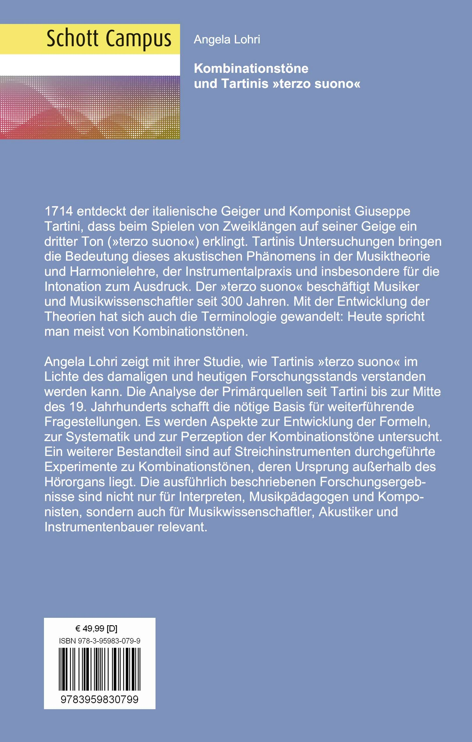 1714 entdeckt der italienische Geiger und Komponist Giuseppe Tartini, dass beim Spielen von Zweiklängen auf seiner Geige ein dritter Ton (»terzo suono«) erklingt. Tartinis Untersuchungen bringen die Bedeutung dieses akustischen Phänomens in der Musiktheorie und Harmonielehre, der Instrumentalpraxis und insbesondere für die Intonation zum Ausdruck. Der »terzo suono« beschäftigt Musiker und Musikwissenschaftler seit 300 Jahren. Mit der Entwicklung der Theorien hat sich auch die Terminologie gewandelt: Heute spricht man meist von Kombinationstönen. Angela Lohri zeigt mit ihrer Studie, wie Tartinis »terzo suono« im Lichte des damaligen und heutigen Forschungsstands verstanden werden kann. Die Analyse der Primärquellen seit Tartini bis zur Mitte des 19. Jahrhunderts schafft die nötige Basis für weiterführende Fragestellungen. Es werden Aspekte zur Entwicklung der Formeln, zur Systematik und zur Perzeption der Kombinationstöne untersucht. Ein weiterer Bestandteil sind auf Streichinstrumenten durchgeführte Experimente zu Kombinationstönen, deren Ursprung außerhalb des Hörorgans liegt. Die ausführlich beschriebenen Forschungsergebnisse sind nicht nur für Interpreten, Musikpädagogen und Komponisten, sondern auch für Musikwissenschaftler, Akustiker und Instrumentenbauer relevant.