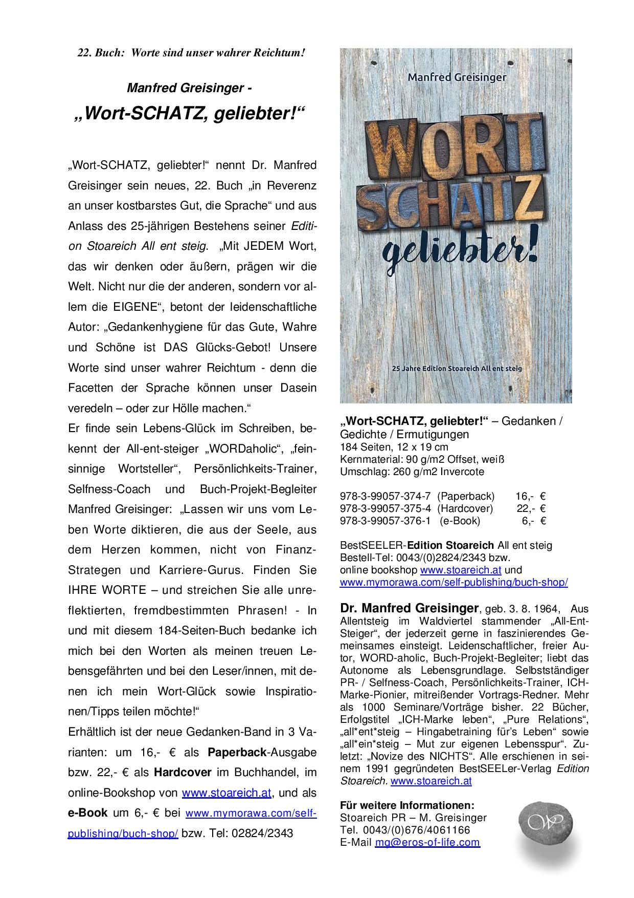 „Ich finde mein Lebens-Glück im Schreiben“, bekennt der All-ent-steiger freie Autor Dr. Manfred Greisinger, „WORDaholic“ und „feinsinniger Wortsteller“, Persönlichkeits-Trainer und Selfness-Coach im 25. Bestandsjahr seiner Edition Stoareich; „in und mit diesem Buch bedanke ich mich bei den Worten als meinen treuen Lebensgefährten. Ich möchte hiermit mein Wort-Glück sowie Inspirationen/Tipps mit Ihnen teilen!“