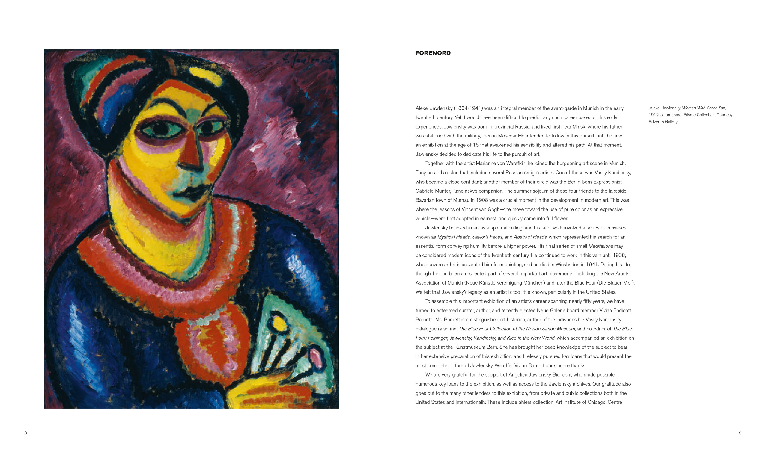 Dieses Buch zeichnet die Einflüsse auf Jawlensky nach, der abgesehen von den deutschen Expressionisten von der Kunst Vincent van Goghs, Paul Gauguins, Paul Cézannes, Henri Matisses, von den Fauves und von Ferdinand Hodler beeinflusst wurde. Das Buch zeichnet die zeitliche und thematische Entwicklung von Jawlenskys Kunst nach, ausgehend von seinen frühen Figuren-Gemälden zu den Landschaften und von den Stillleben zu den späten ikonischen Porträts und faszinierenden Meditationen.