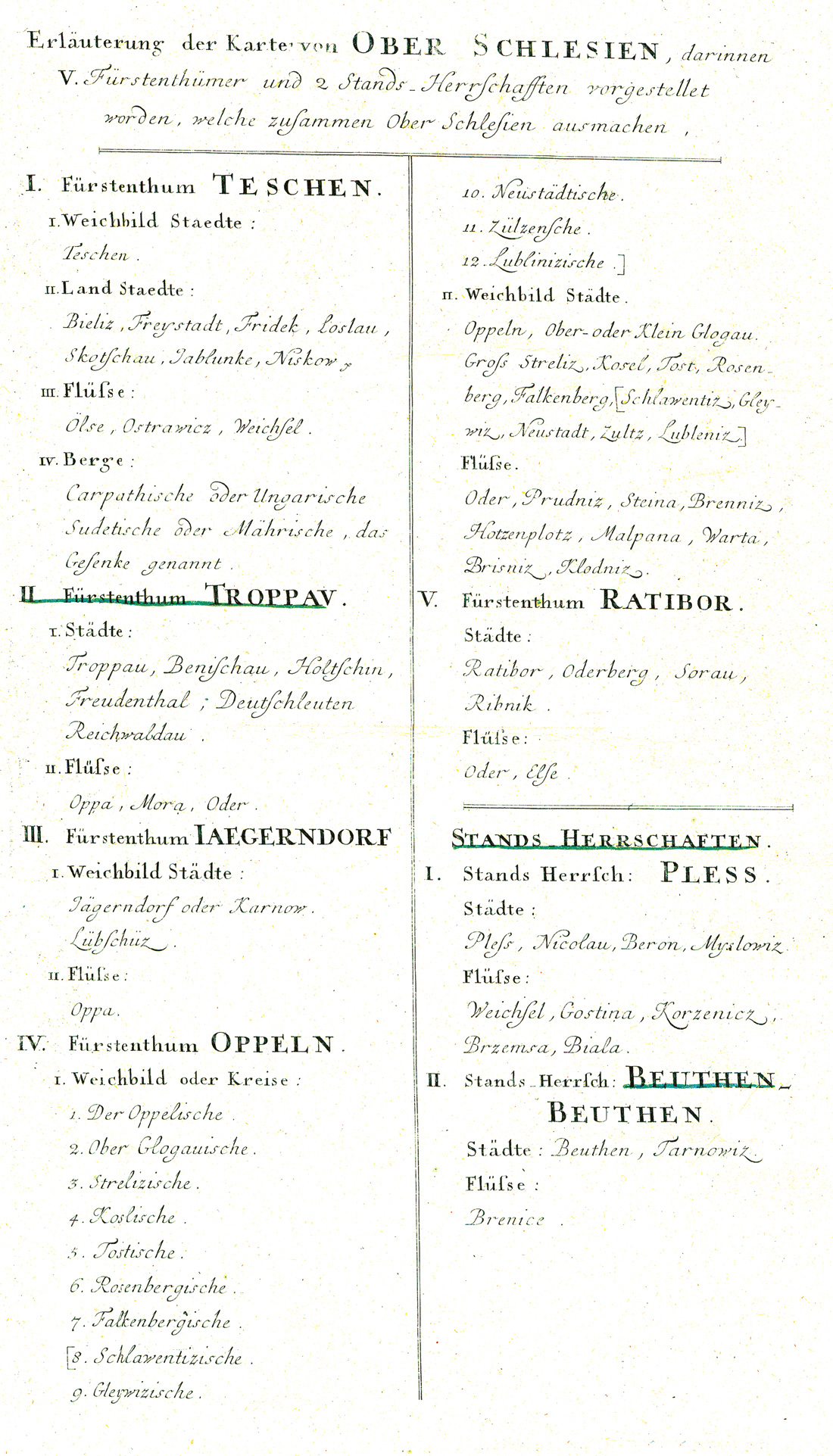 | Schlagworte | II. Fürstenthum TROPPAV --- I. Städte: Troppau, Benischau, Holtschin, Freudenthal, Deutschleuten, Reichwaldau II. Flüsse: Oppa, Mora, Oder • II. Fürstenthum TROPPAV --- I. Städte: Troppau, Benischau, Holtschin, Freudenthal, Deutschleuten, Reichwaldau II. Flüsse: Oppa, Mora, Oder • III. Flüsse: Oder, Prudniz, Steina, Brenniz, Hotzenplotz, Malpana, Warta IV. Fürstenthum RATIBOR --- I. Städte: Ratibor, Oderberg, Sorau, Ribnik II. Flüsse: Oder, Else • III. Flüsse: Oder, Prudniz, Steina, Brenniz, Hotzenplotz, Malpana, Warta IV. Fürstenthum RATIBOR --- I. Städte: Ratibor, Oderberg, Sorau, Ribnik II. Flüsse: Oder, Else • III. Fürstenthum IAEGERNDORF --- I. Weichbild Städte: Jägerndorf oder Karnow, Lübschüz II. Flüsse: Oppa • III. Fürstenthum IAEGERNDORF --- I. Weichbild Städte: Jägerndorf oder Karnow, Lübschüz II. Flüsse: Oppa • III. Fürstenthum OPPELN --- I. Weichbild oder Kreise: 1. Der Oppelsche 2. Ober Glogausche 3. Strelizische 4. Koslische 5. Tostische 6. Rosenbergische 7. Falkenberbische 8. Schlawentzische 9. Gleywizische 10. Neustädtische 11. Lüzensche 12. Lublinzische • III. Fürstenthum OPPELN --- I. Weichbild oder Kreise: 1. Der Oppelsche 2. Ober Glogausche 3. Strelizische 4. Koslische 5. Tostische 6. Rosenbergische 7. Falkenberbische 8. Schlawentzische 9. Gleywizische 10. Neustädtische 11. Lüzensche 12. Lublinzische • II. Weichbild Städte Oppeln, Ober- oder Klein Golgau, Groß Streliz, Kosel, Tost, Rosenberg, Falkenberg, Schlawentiz, Gleywiz, Neustadt, Zultz, Lubeniz • II. Weichbild Städte Oppeln, Ober- oder Klein Golgau, Groß Streliz, Kosel, Tost, Rosenberg, Falkenberg, Schlawentiz, Gleywiz, Neustadt, Zultz, Lubeniz • I. Stands Herrsch: BEUTHEN --- Städte: Beuthen, Trnowiz Flüsse: Brenice • I. Stands Herrsch: BEUTHEN --- Städte: Beuthen, Trnowiz Flüsse: Brenice • I. Stands Herrsch: PLESS --- Städte: Pless, Nicola, Beron, Myslowiz Flüsse: Weichsel, Gostina, Korzenicz, Brzemsa, Biala • I. Stands Herrsch: PLESS --- Städte: Pless, Nicola, Beron, Myslowiz Flüsse: Weichsel, Gostina, Korzenicz, Brzemsa, Biala • I. Weichbild Städte: Teschen II. Land Städte: Bieliz, Freystadt, Fridek, Losau, Skotschau, Jablunke, Niskow III. Flüsse: Ölse, Ostrawicz, Weichsel IV. Berge: Carpathische oder Ungarische Sudetische oder Mährische, das Gesenke • I. Weichbild Städte: Teschen II. Land Städte: Bieliz, Freystadt, Fridek, Losau, Skotschau, Jablunke, Niskow III. Flüsse: Ölse, Ostrawicz, Weichsel IV. Berge: Carpathische oder Ungarische Sudetische oder Mährische, das Gesenke |